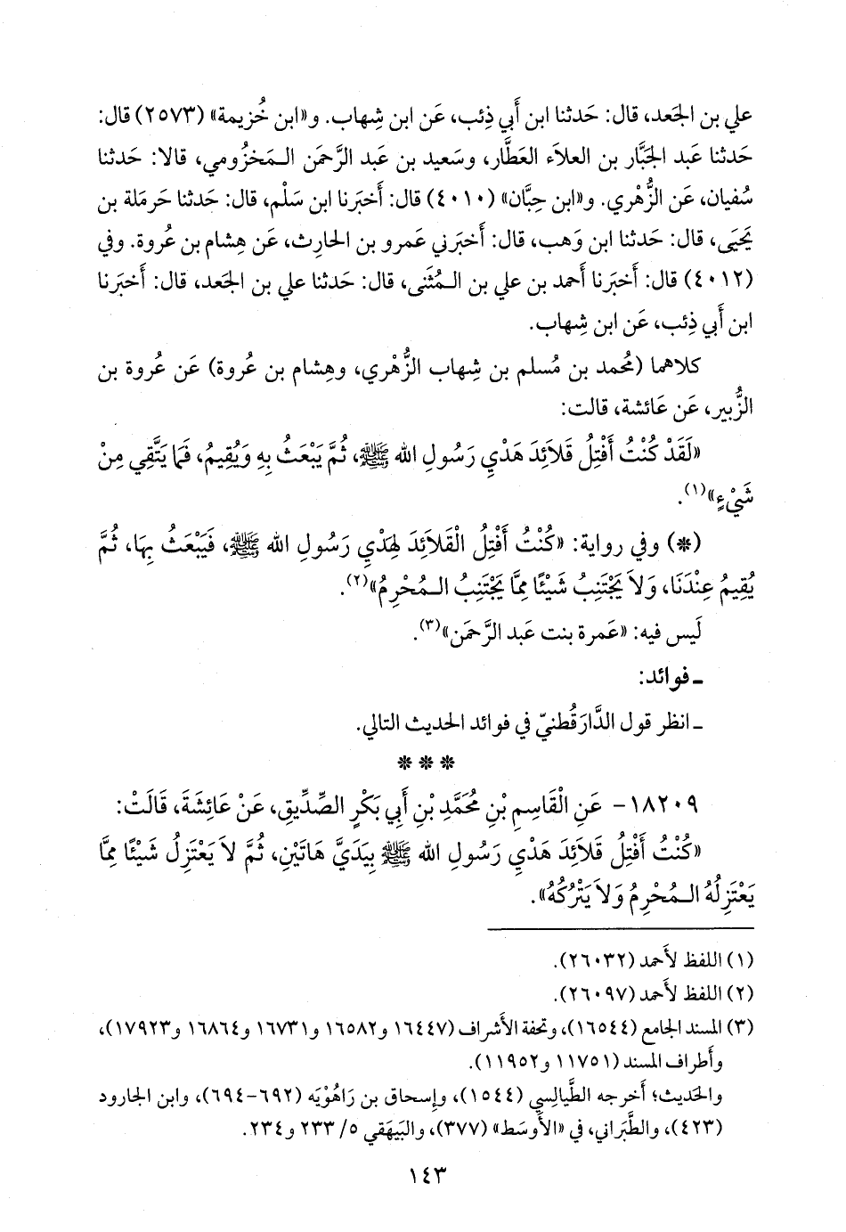 - وفي رواية: «كان رسول الله صَلى الله عَليه وسَلم يبعث بالهدي، أفتل قلائدها بيدي، ثم لا يمسك عن شيء لا يمسك عنه الحلال» (¬٢).