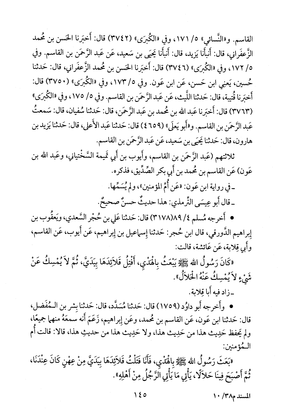 • وأخرجه أَبو داود (١٧٥٩) قال: حدثنا مُسدد، قال: حدثنا بشر بن المُفَضَّل، قال: حدثنا ابن عَون، عن القاسم بن محمد، وعن إبراهيم، زعم أنه سمعه منهما جميعا، ولم يحفظ حديث هذا من حديث هذا، ولا حديث هذا من حديث هذا، قالا: قالت أُم المؤمنين: