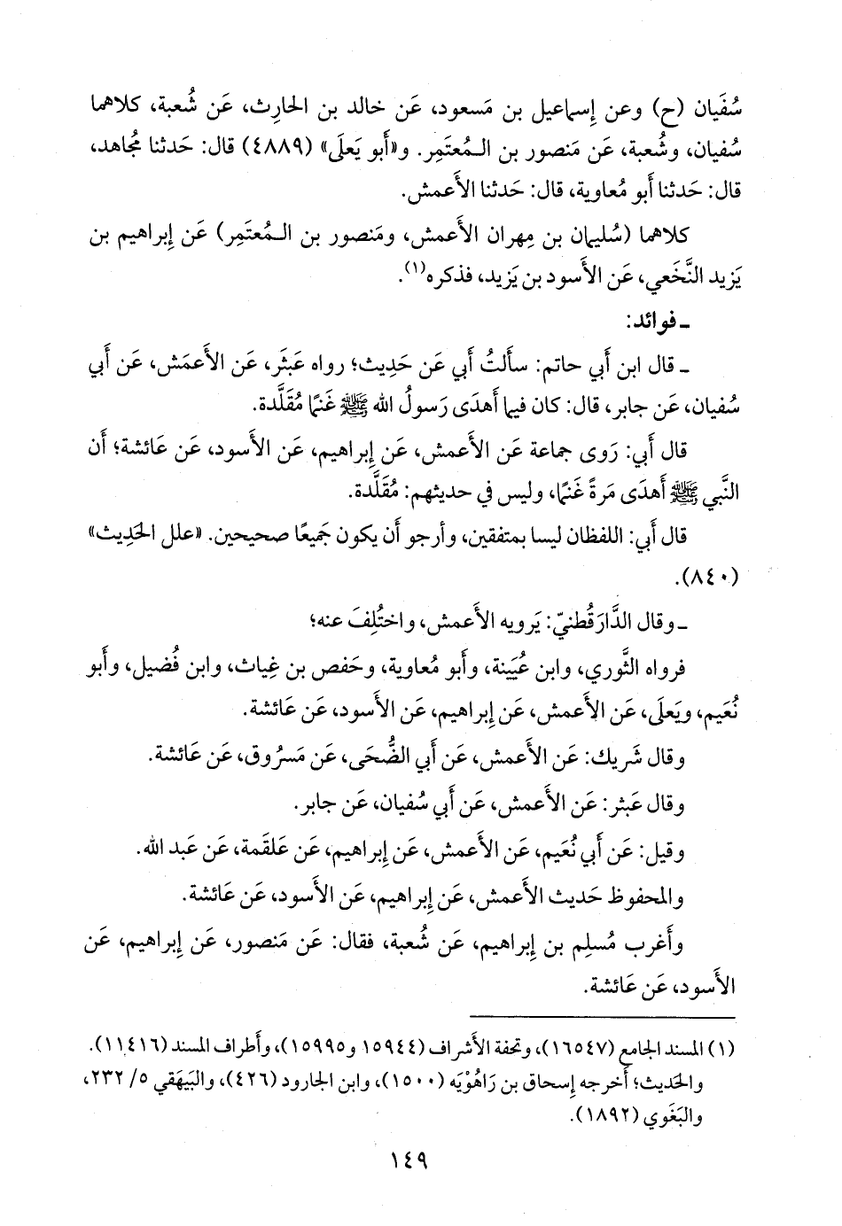 قال أبي: روى جماعة عن الأعمش، عن إبراهيم، عن الأسود، عن عائشة؛ أن النبي صَلى الله عَليه وسَلم أهدى مرة غنما، وليس في حديثهم: مقلدة.