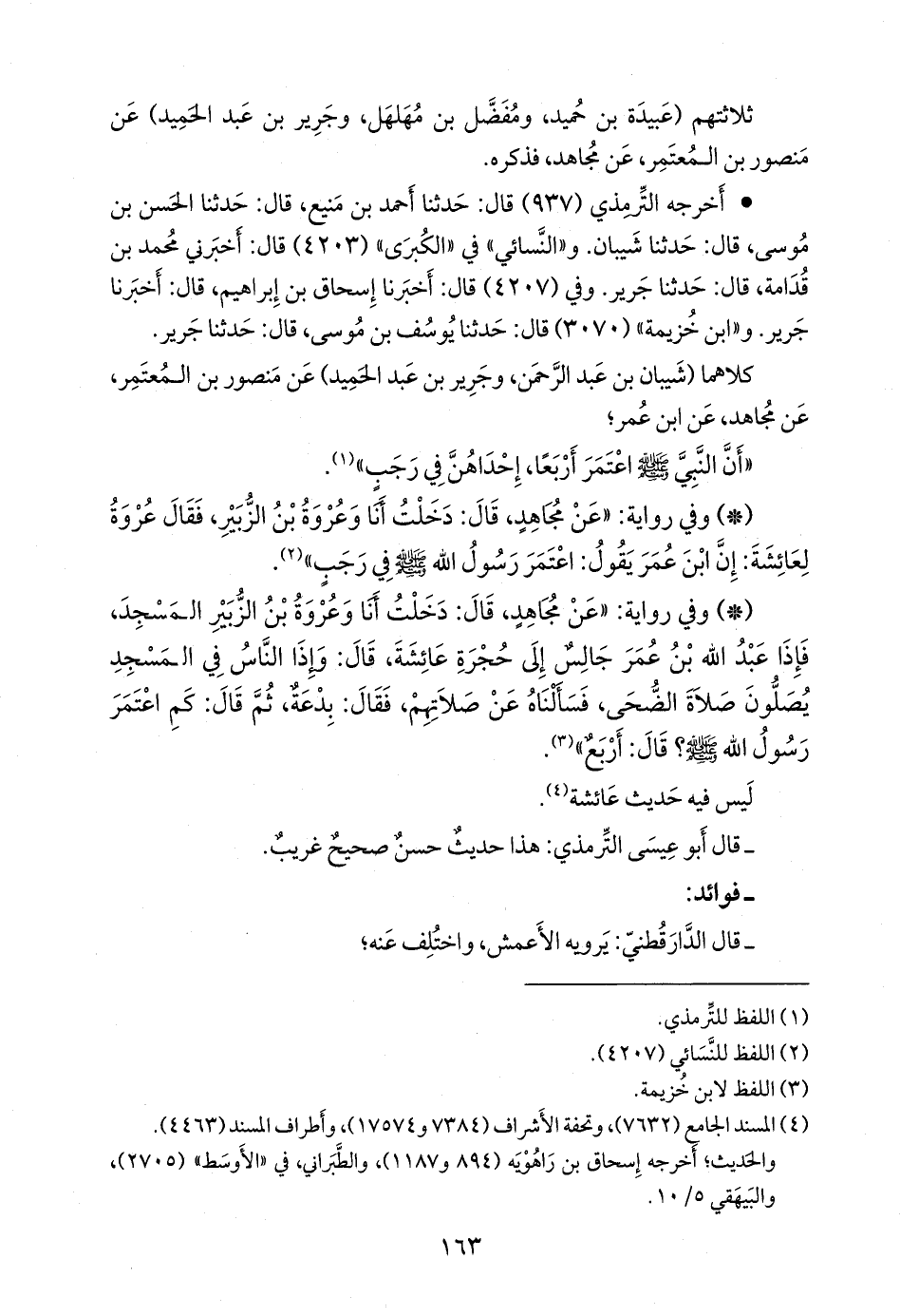 - وفي رواية: «عن مجاهد، قال: دخلت أنا وعروة بن الزبير المسجد، فإذا عبد الله بن عمر جالس إلى حجرة عائشة، قال: وإذا الناس في المسجد يصلون صلاة الضحى، فسألناه عن صلاتهم، فقال: بدعة، ثم قال: كم اعتمر رسول الله صَلى الله عَليه وسَلم؟ قال: أربع» (¬٣).