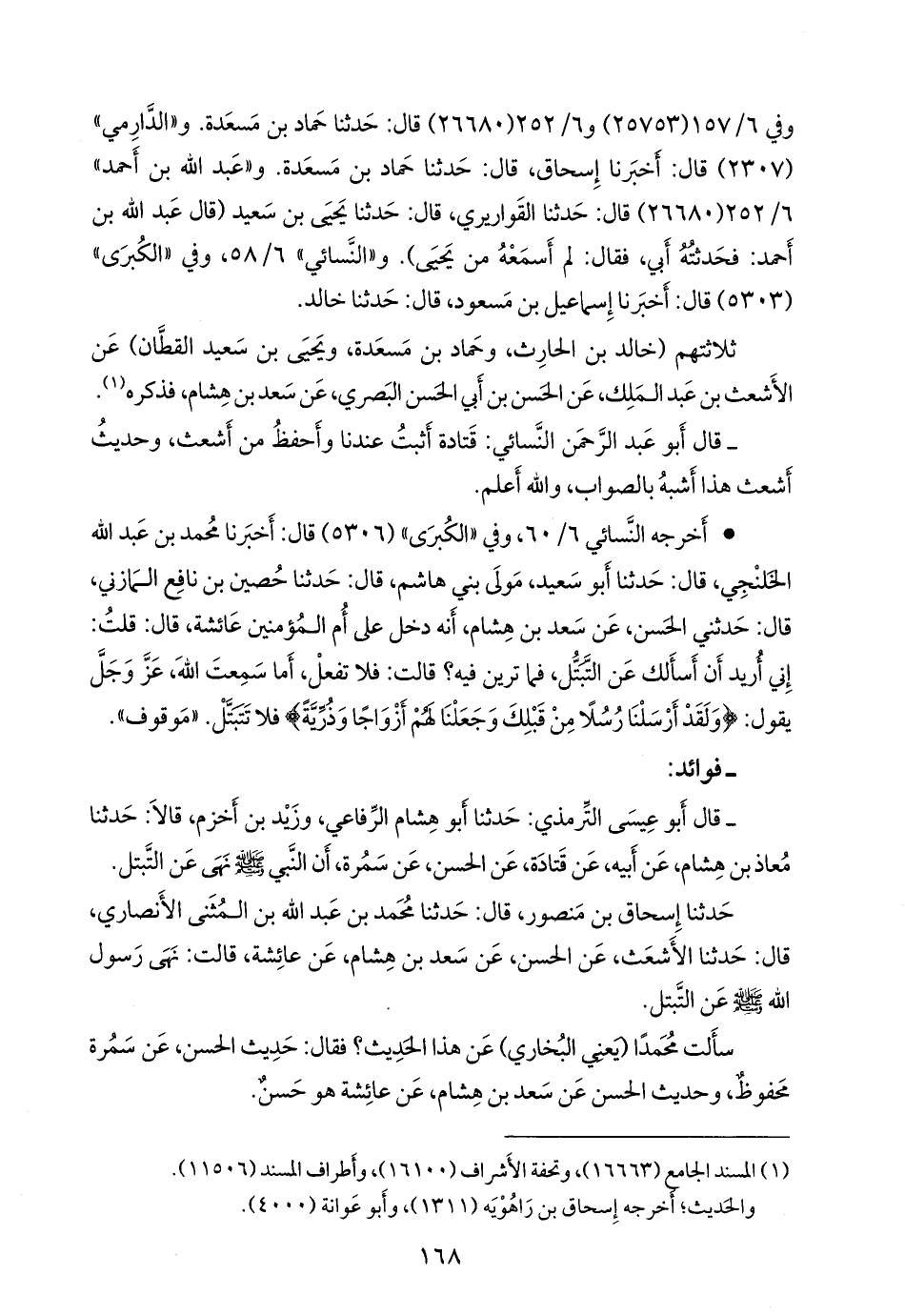 ثلاثتهم (خالد بن الحارث، وحماد بن مَسعَدة، ويحيى بن سعيد القطان) عن الأشعث بن عبد الملك، عن الحسن بن أبي الحسن البصري، عن سعد بن هشام، فذكره (¬١).