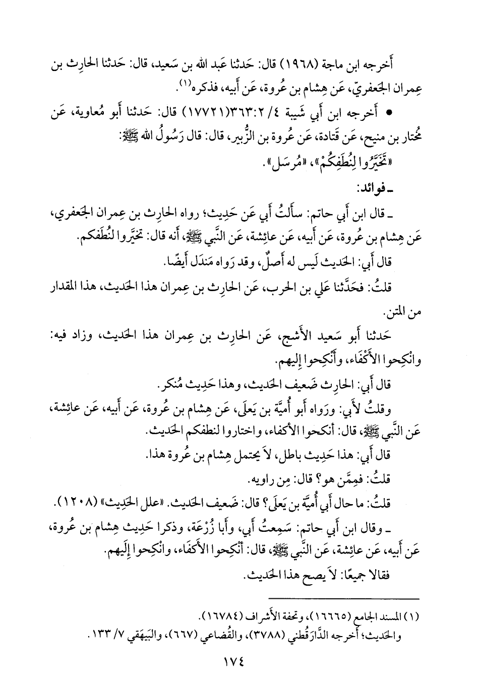 - قلنا: إِسناده ضعيفٌ؛ قال ابن أبي حاتم: سألتُ أبي عن حديثٍ؛ رواه الحارث بن عمران الجعفري، عن هشام بن عروة، عن أبيه، عن عائشة، عن النبي صَلى الله عَليه وسَلم أنه قال: تخيروا لنطفكم.