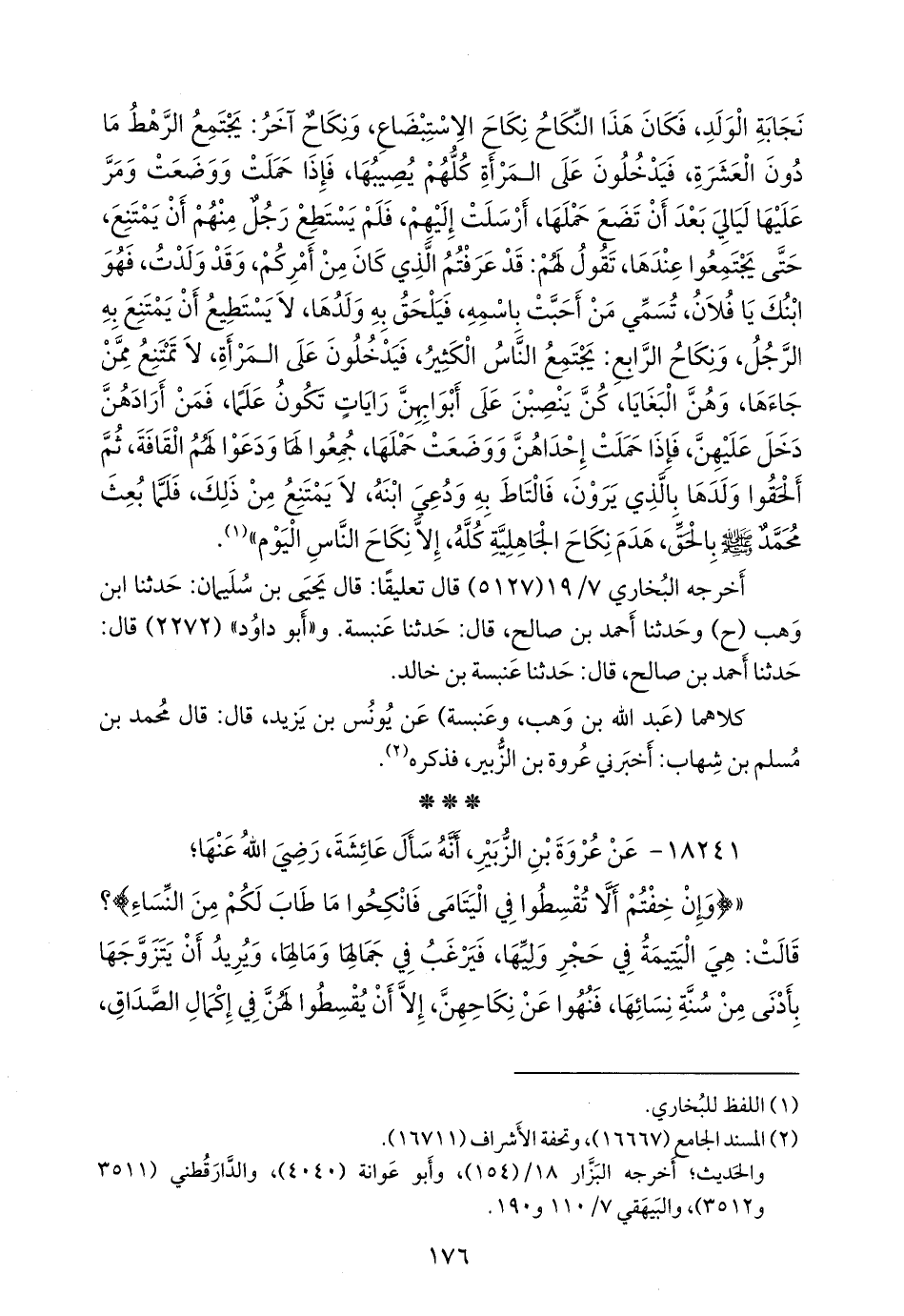 - وفي رواية: «عن عروة بن الزبير، أنه سأل عائشة عن قول الله تعالى: {وإن خفتم ألا تقسطوا في اليتامى} فقالت: يا ابن أختي، هذه اليتيمة تكون في حجر وليها، تشركه في ماله، ويعجبه مالها وجمالها، فيريد وليها أن يتزوجها بغير أن يقسط في صداقها، فيعطيها مثل ما يعطيها غيره، فنهوا عن أن ينكحوهن إلا أن يقسطوا لهن، ويبلغوا لهن أعلى سنتهن في الصداق، فأمروا أن ينكحوا ما طاب لهم من النساء سواهن.