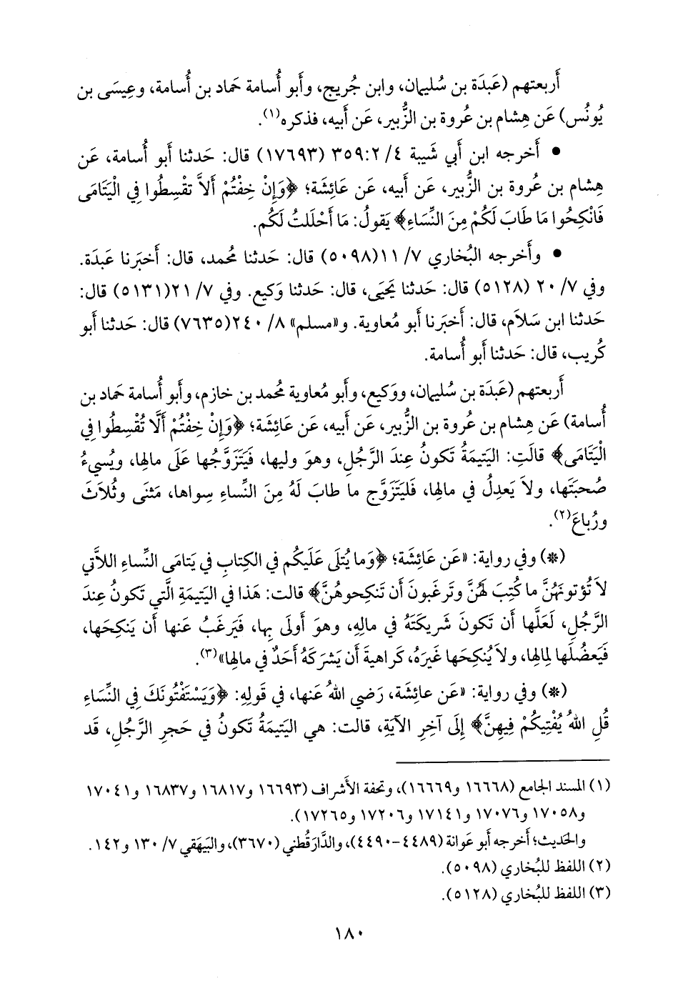 أربعتهم (عَبدة بن سليمان، ووكيع، وأَبو معاوية محمد بن خازم، وأَبو أسامة حماد بن أسامة) عن هشام بن عروة بن الزبير، عن أبيه، عن عائشة؛ {وإن خفتم ألا تقسطوا في اليتامى} قالت: اليتيمة تكون عند الرجل، وهو وليها، فيتزوجها على مالها، ويسيء صحبتها، ولا يعدل في مالها، فليتزوج ما طاب له من النساء سواها، مثنى وثلاث ورباع (¬١).