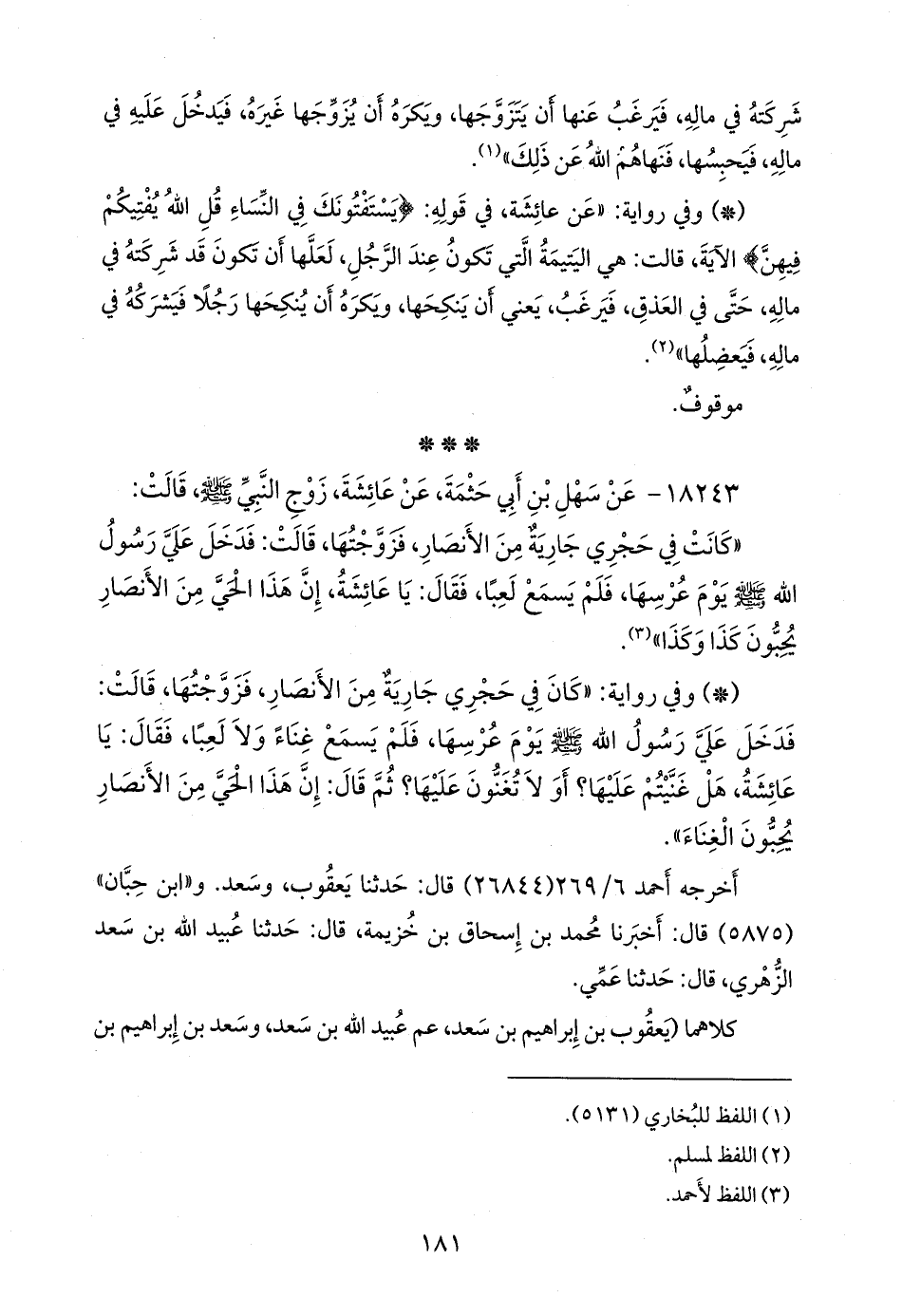 - وفي رواية: «كان في حجري جارية من الأنصار، فزوجتها، قالت: فدخل علي رسول الله صَلى الله عَليه وسَلم يوم عرسها، فلم يسمع غناء ولا لعبا، فقال: يا عائشة، هل غنيتم عليها؟ أو لا تغنون عليها؟ ثم قال: إن هذا الحي من الأنصار يحبون الغناء».