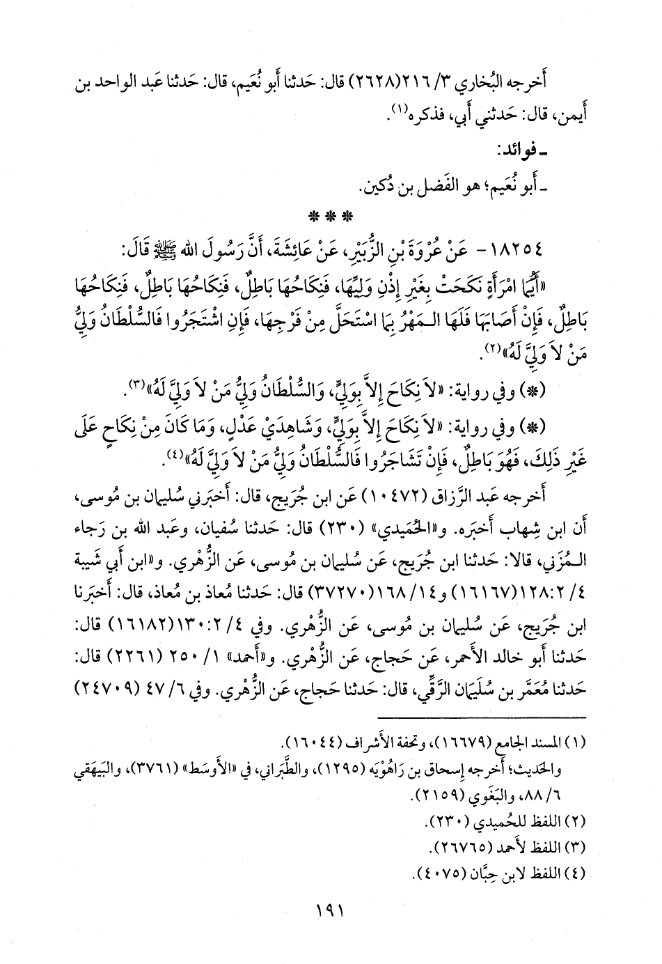 - وفي رواية: «لا نكاح إلا بولي، وشاهدي عدل، وما كان من نكاح على غير ذلك، فهو باطل، فإن تشاجروا فالسلطان ولي من لا ولي له» (¬٣).
