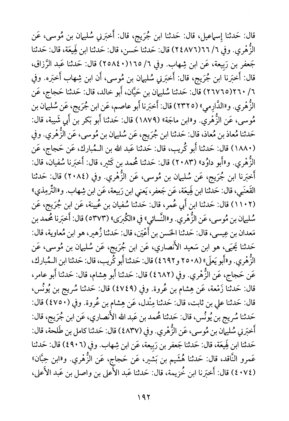 وفي (٤٧٤٩) قال: حدثنا سريج بن يونس، قال: حدثنا علي بن ثابت، قال: حدثنا مندل، عن هشام بن عروة. وفي (٤٧٥٠) قال: حدثنا سريج بن يونس، قال: حدثنا محمد بن عبد الله الأَنصاري، عن ابن جُريج، قال: أخبرني سليمان بن موسى، عن الزُّهْري. وفي (٤٨٣٧) قال: حدثنا كامل بن طلحة، قال: حدثنا ابن لَهِيعة، قال: حدثنا جعفر بن ربيعة، عن ابن شهاب. وفي (٤٩٠٦) قال: حدثنا عَمرو الناقد، قال: حدثنا هُشيم بن بشير، عن حجاج، عن الزُّهْري. و «ابن حِبَّان» (٤٠٧٤) قال: أخبرنا ابن خزيمة، قال: حدثنا عبد الأعلى بن واصل بن عبد الأعلى،