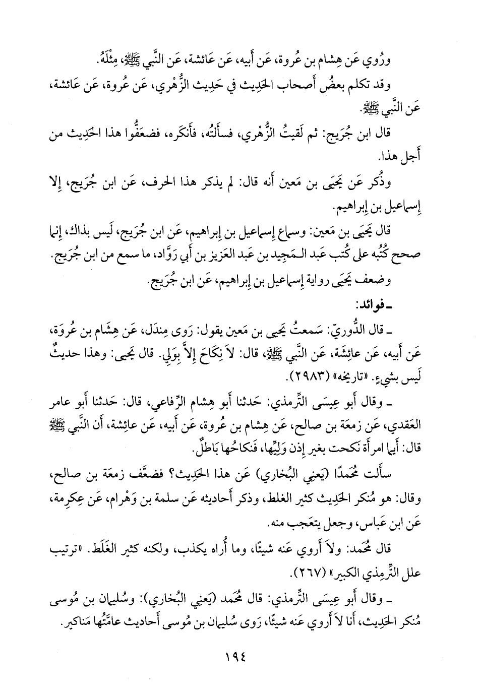 - وقال التِّرمِذي: حدثنا أَبو هشام الرفاعي، قال: حدثنا أَبو عامر العَقَدي، عن زمعة بن صالح، عن هشام بن عروة، عن أبيه، عن عائشة، أن النبي صَلى الله عَليه وسَلم قال: أيما امرأة نكحت بغير إذن وليها، فنكاحها باطل.
