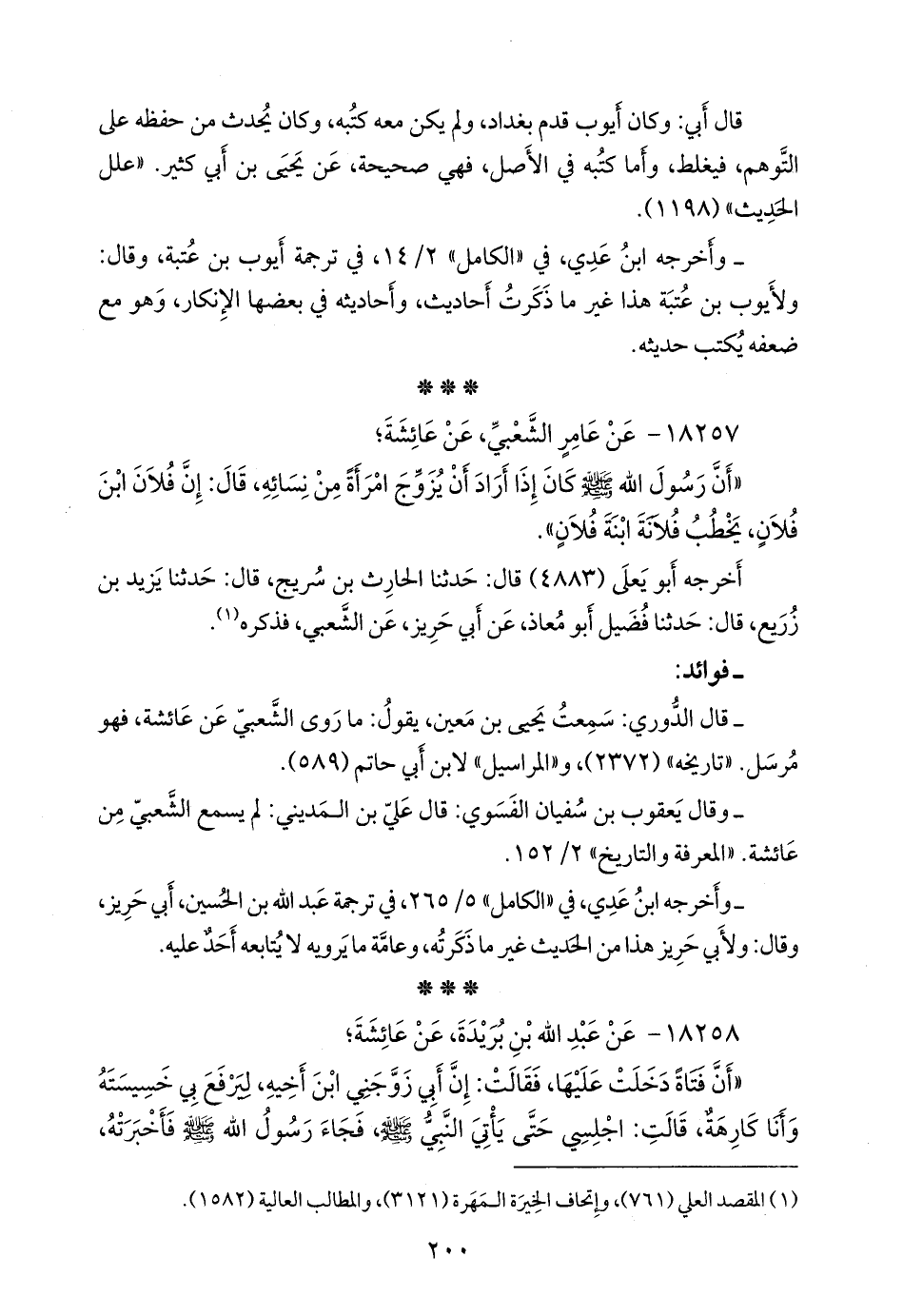 - قال عباس الدُّوري: سمعت يحيى بن مَعين، يقول: ما روى الشعبي عن عائشة، فهو مرسل. «تاريخه» (٢٣٧٢)، و «المراسيل» لابن أبي حاتم (٥٨٩).