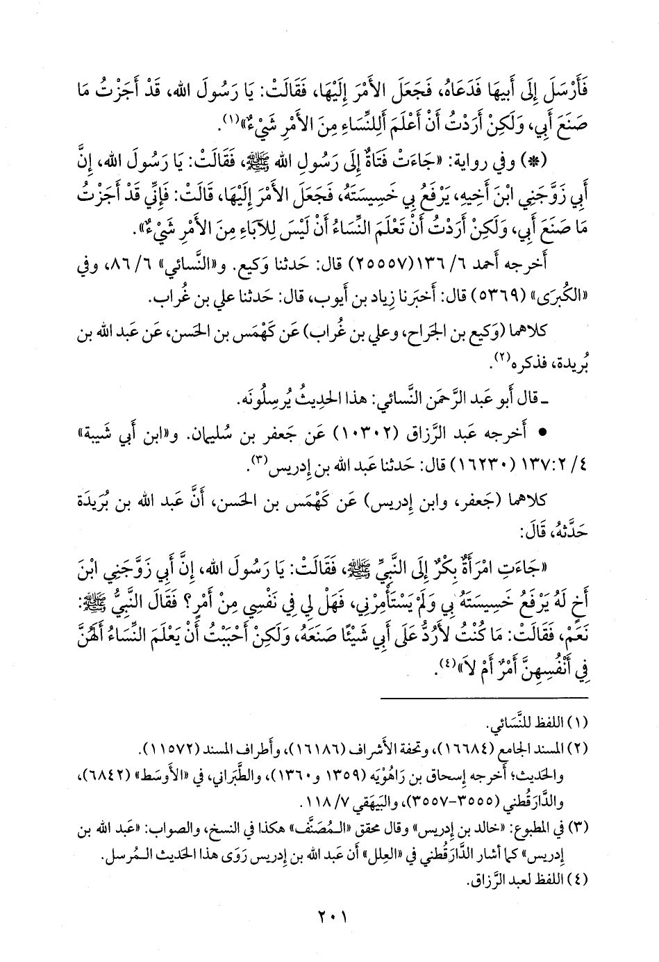 - وفي رواية: «جاءت فتاة إلى عائشة، فقالت: إن أبي زوجني من ابن أخيه ليرفع بي خسيسته، وإني كرهت ذلك، فقالت لها عائشة: انتظري حتى يأتي رسول الله صَلى الله عَليه وسَلم فلما جاء رسول الله صَلى الله عَليه وسَلم أرسل إلى أبيها، فجعل الأمر إليها، فقالت: أما إذا كان الأمر إلي فقد أجزت ما صنع أبي، إنما أردت أن أعلم هل للنساء من الأمر شيء». «مُرسَل».