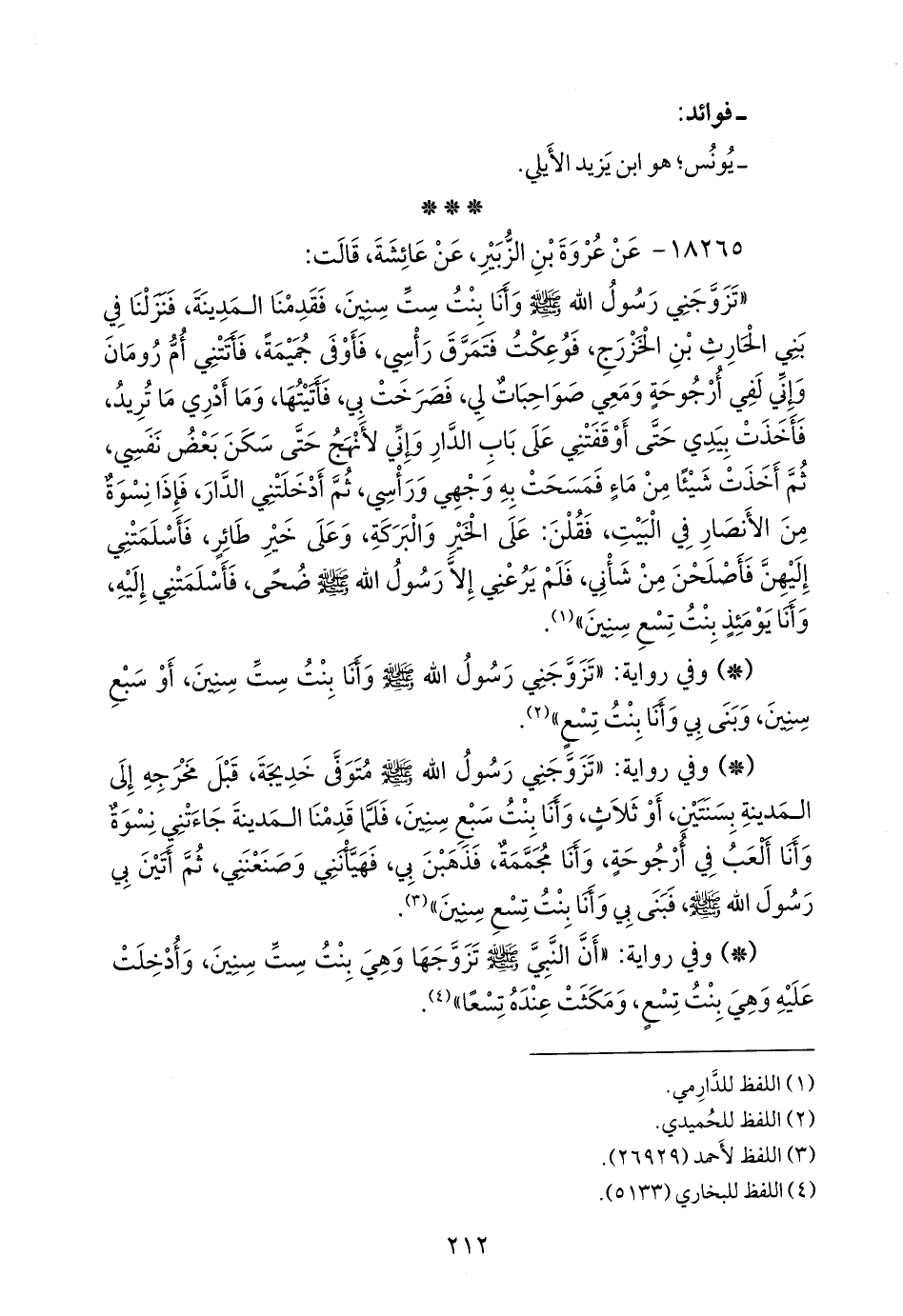 - وفي رواية: «تزوجني رسول الله صَلى الله عَليه وسَلم وأنا بنت ست سنين، أو سبع سنين، وبنى بي وأنا بنت تسع» (¬٢).