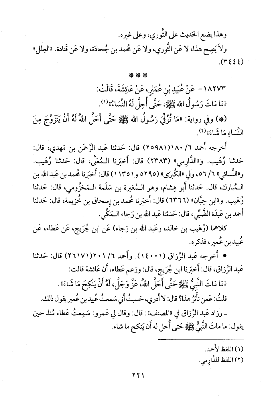 • أَخرجه عبد الرزاق (١٤٠٠١). وأحمد (٢٦١٧١) قال: حدثنا عبد الرزاق، قال: أخبرنا ابن جُريج، قال: وزعم عطاء، أن عائشة قالت: