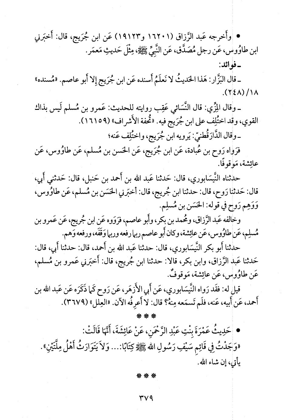 حدثنا أَبو بكر النيسابوري، قال: حدثنا عبد الله بن أحمد، قال: حدثنا أبي، قال: حدثنا عبد الرزاق، وابن بكر، قالا: حدثنا ابن جُريج، قال: أخبرني عَمرو بن مسلم، عن طاووس، عن عائشة، موقوف.