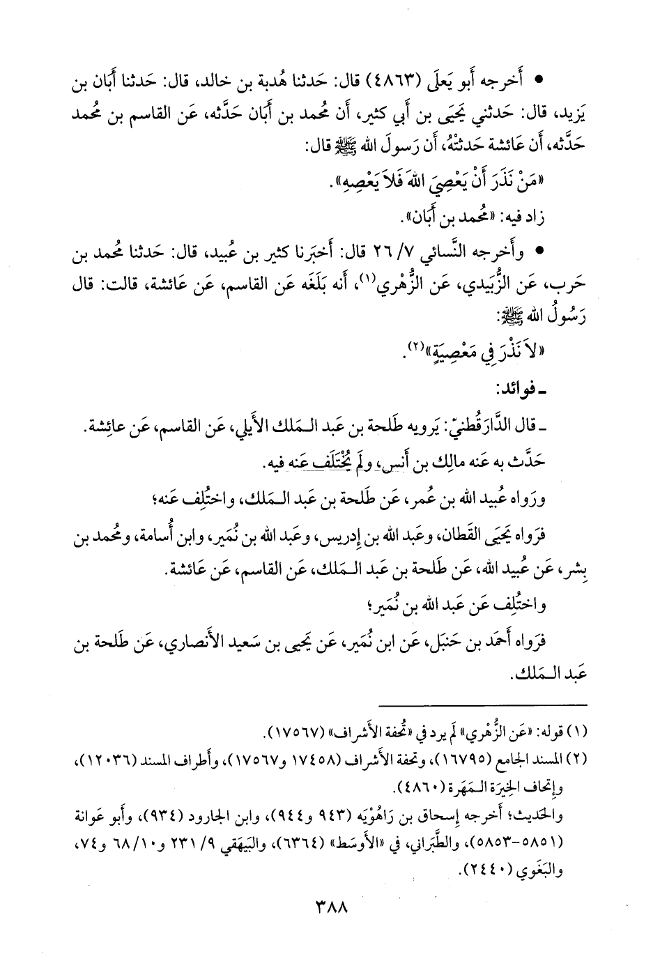 حدثنا أَبو علي المالكي محمد بن سليمان، قال: حدثنا محمد بن بشار، قال: حدثنا يحيى بن سعيد، قال: حدثنا مالك، عن طلحة بن عبد الملك الأيلي، عن القاسم، عن عائشة؛ أن رسول الله صَلى الله عَليه وسَلم قال: من نذر أن يطيع الله فليطعه، ومن نذر أن يعصي الله فلا يعصه. «العلل» (٣٥٩٠).
