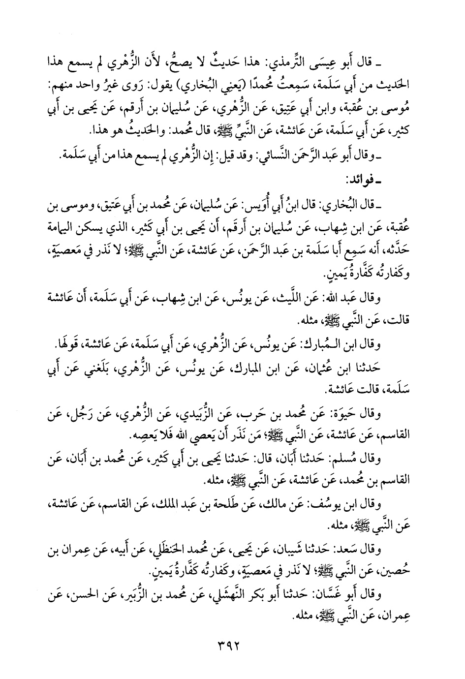 - قال البخاري: قال ابن أبي أويس: عن سليمان، عن محمد بن أبي عتيق، وموسى بن عُقبة، عن ابن شهاب، عن سليمان بن أرقم، أن يحيى بن أبي كثير، الذي يسكن اليمامة حدثه، أنه سمع أبا سلمة بن عبد الرَّحمَن، عن عائشة، عن النبي صَلى الله عَليه وسَلم؛ لا نذر في معصية، وكفارته كفارة يمين.