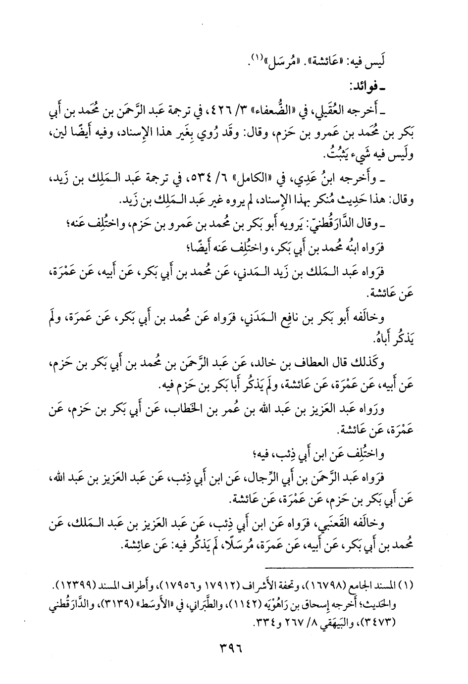 فرواه عبد الرَّحمَن بن أبي الرجال، عن ابن أبي ذِئب، عن عبد العزيز بن عبد الله، عن أَبي بكر بن حزم، عن عَمرَة، عن عائشة.
