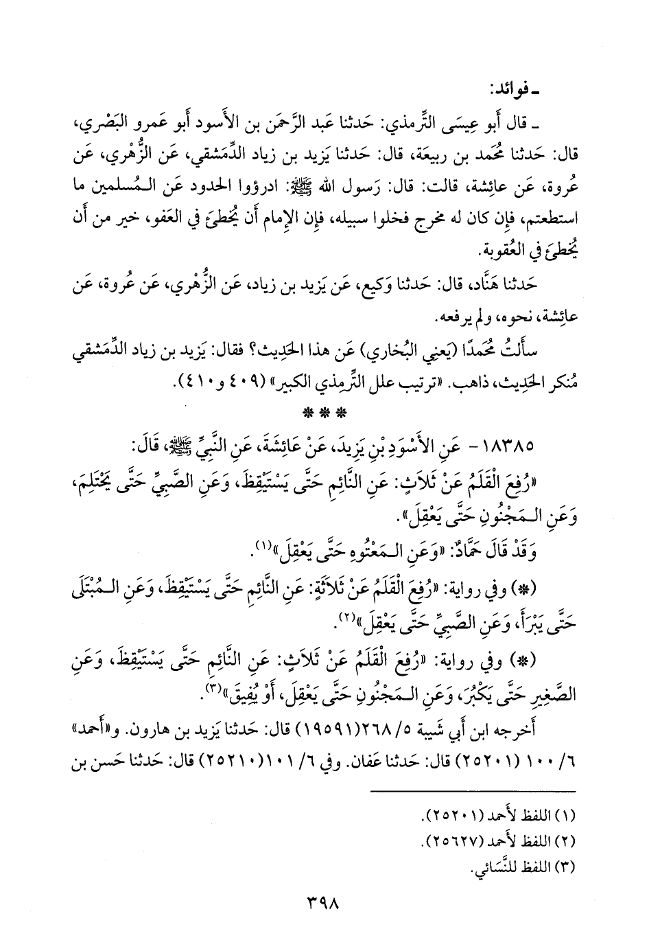 - وفي رواية: «رفع القلم عن ثلاث: عن النائم حتى يستيقظ، وعن الصغير حتى يكبر، وعن المجنون حتى يعقل، أو يفيق» (¬٣).