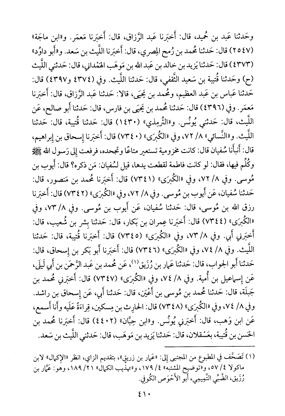 (¬١) تصحف في المطبوع من المجتبى إلى: «عمار بن زريق»، بتقديم الزاي، انظر «الإكمال» لابن ماكولا ٤/ ٥٧، و «توضيح المُشْتَبِه» ٤/ ١٧٩، و «تهذيب الكمال» ٢١/ ١٨٩، وهو: عمار بن رُزيق، الضبي التميمي، أَبو الأحوص الكوفي.
