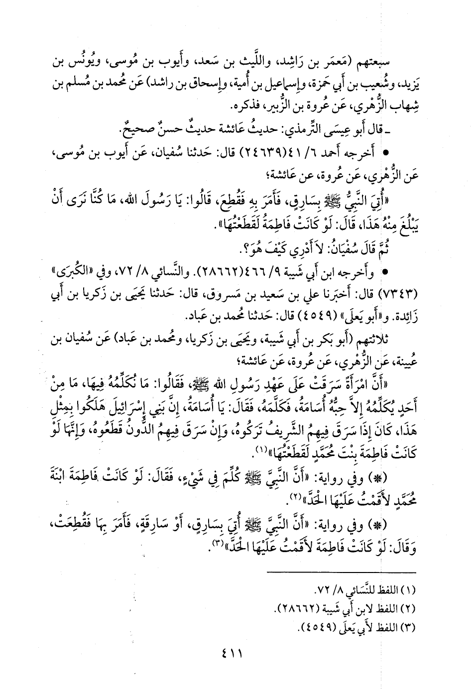 - وفي رواية: «أن النبي صَلى الله عَليه وسَلم أتي بسارق، أو سارقة، فأمر بها فقطعت، وقال: لو كانت فاطمة لأقمت عليها الحد» (¬١).
