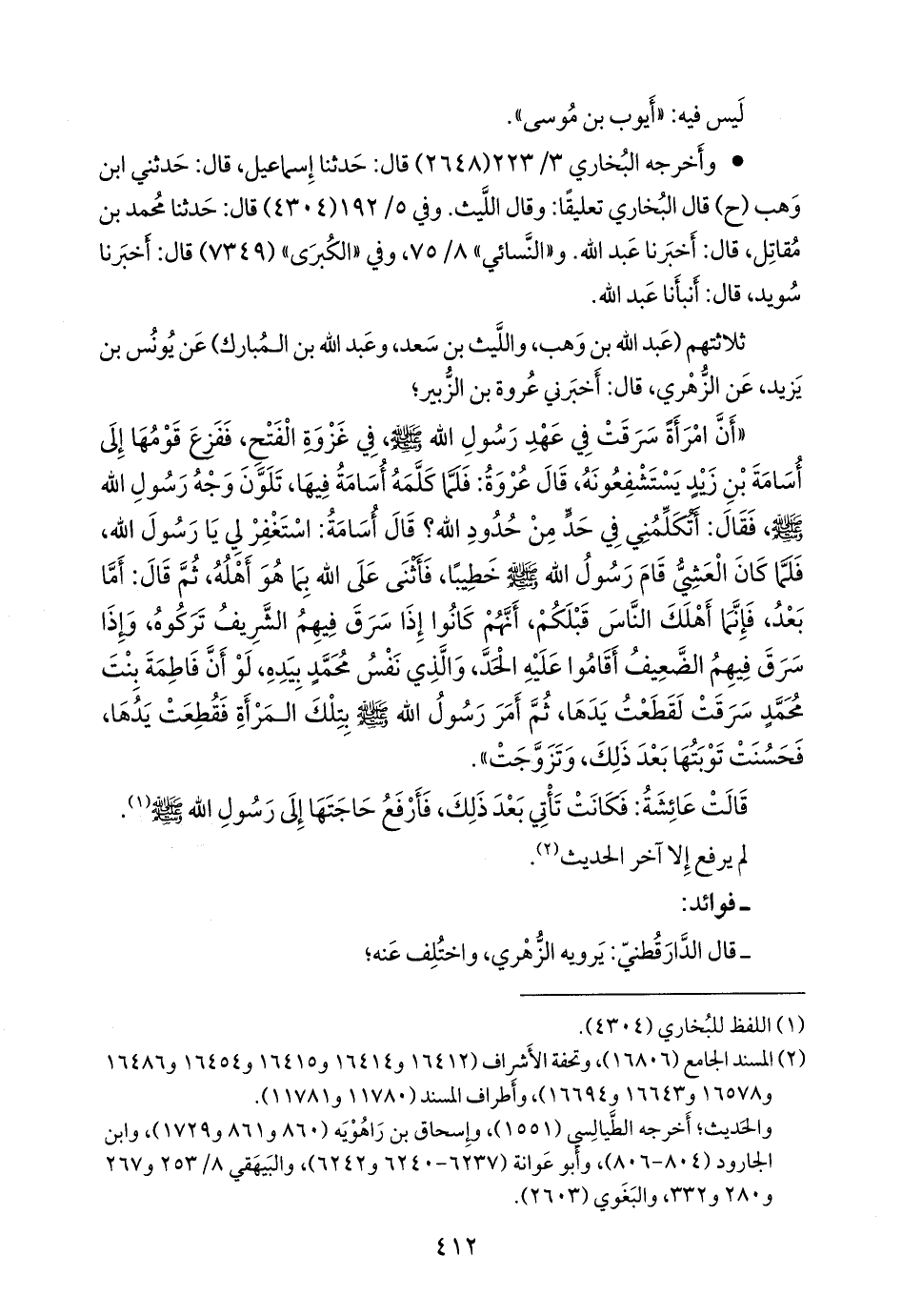 ورواه ابن أبي حمزة، وابن أخي الزُّهْري، عن الزُّهْري، عن القاسم، عن عائشة؛ أن تلك المرأة المقطوعة تابت، فكانت تأتيني فأرفع حاجتها إلى رسول الله صَلى الله عَليه وسَلم وذلك صحيح عن الزُّهْري، عن القاسم، عن عائشة. «العلل» (٣٤٦٦).