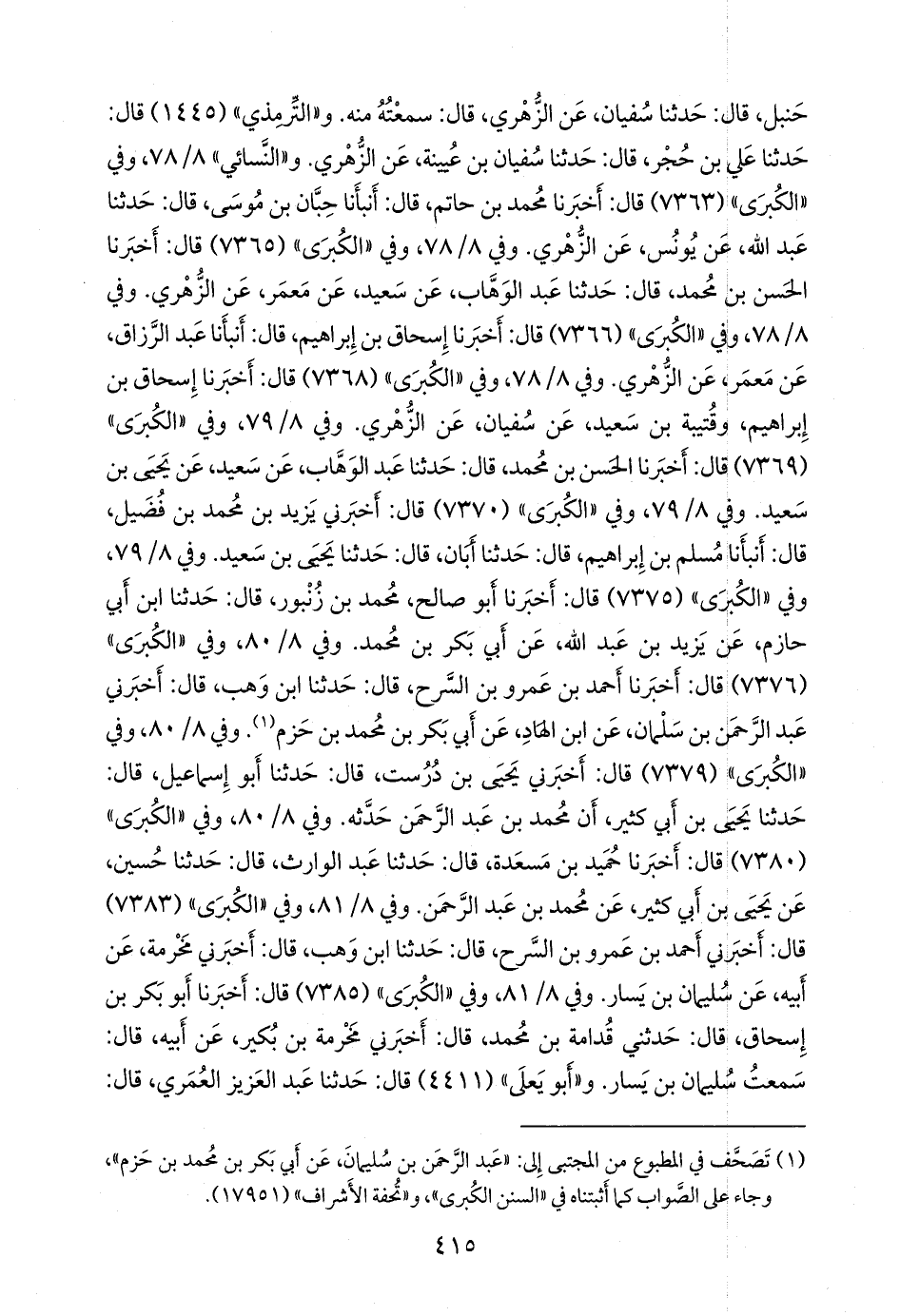 وفي ٨/ ٧٨، وفي «الكبرى» (٧٣٦٨) قال: أخبرنا إسحاق بن إبراهيم، وقتيبة بن سعيد، عن سفيان، عن الزُّهْري. وفي ٨/ ٧٩، وفي «الكبرى» (٧٣٦٩) قال: أخبرنا الحسن بن محمد، قال: حدثنا عبد الوَهَّاب، عن سعيد، عن يحيى بن سعيد. وفي ٨/ ٧٩، وفي «الكبرى» (٧٣٧٠) قال: أخبرني يزيد بن محمد بن فضيل، قال: أنبأنا مسلم بن إبراهيم، قال: حدثنا أبان، قال: حدثنا يحيى بن سعيد. وفي ٨/ ٧٩، وفي «الكبرى» (٧٣٧٥) قال: أخبرنا أَبو صالح، محمد بن زنبور، قال: حدثنا ابن أبي حازم، عن يزيد بن عبد الله، عن أَبي بكر بن محمد. وفي ٨/ ٨٠، وفي «الكبرى» (٧٣٧٦) قال: أخبرنا أحمد بن عَمرو بن السَّرح، قال: حدثنا ابن وهب، قال: أخبرني عبد الرَّحمَن بن سلمان، عن ابن الهاد، عن أَبي بكر بن محمد بن حزم (¬١). وفي ٨/ ٨٠، وفي «الكبرى» (٧٣٧٩) قال: أخبرني يحيى بن دُرُست، قال: حدثنا أَبو إسماعيل، قال: حدثنا يحيى بن أبي كثير، أن محمد بن عبد الرَّحمَن حدثه. وفي ٨/ ٨٠، وفي «الكبرى» (٧٣٨٠) قال: أخبرنا حميد بن مَسعَدة، قال: حدثنا عبد الوارث، قال: حدثنا حسين، عن يحيى بن أبي كثير، عن محمد بن عبد الرَّحمَن. وفي ٨/ ٨١، وفي «الكبرى» (٧٣٨٣) قال: أخبرني أحمد بن عَمرو بن السَّرح، قال: حدثنا ابن وهب، قال: أخبرني مخرمة، عن أبيه، عن سليمان بن يسار. وفي ٨/ ٨١، وفي «الكبرى» (٧٣٨٥) قال: أخبرنا أَبو بكر بن إسحاق، قال: حدثني قدامة بن محمد، قال: أخبرني مَخرَمة بن بُكير، عن أبيه، قال: سمعت سليمان بن يسار. و «أَبو يَعلى» (٤٤١١) قال: حدثنا عبد العزيز العمري، قال: