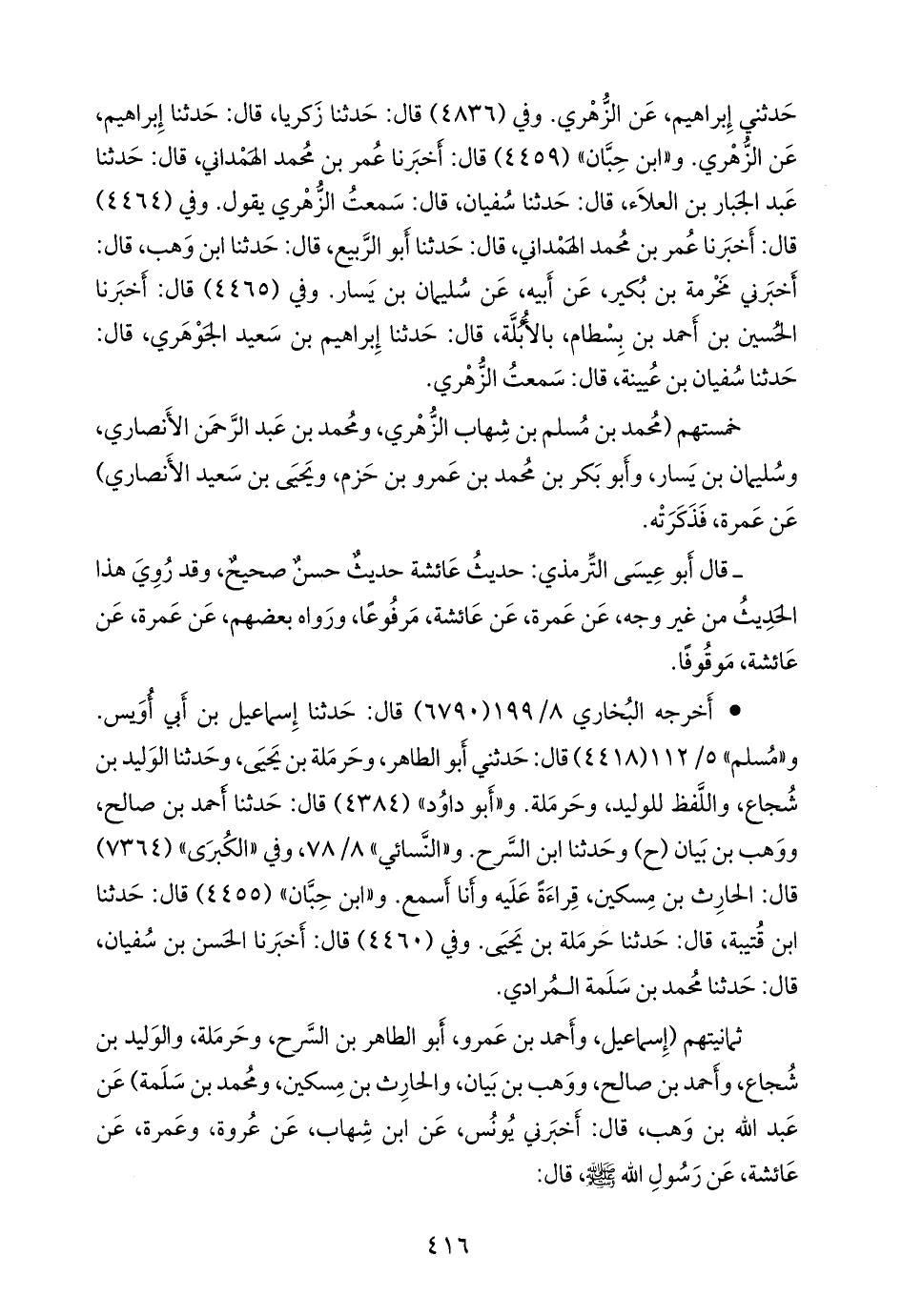 وفي (٤٤٦٤) قال: أخبرنا عمر بن محمد الهمداني، قال: حدثنا أَبو الربيع، قال: حدثنا ابن وهب، قال: أخبرني مَخرَمة بن بُكير، عن أبيه، عن سليمان بن يسار. وفي (٤٤٦٥) قال: أخبرنا الحسين بن أحمد بن بِسطام، بالأبلة، قال: حدثنا إبراهيم بن سعيد الجوهري، قال: حدثنا سفيان بن عُيينة، قال: سمعت الزُّهْري.