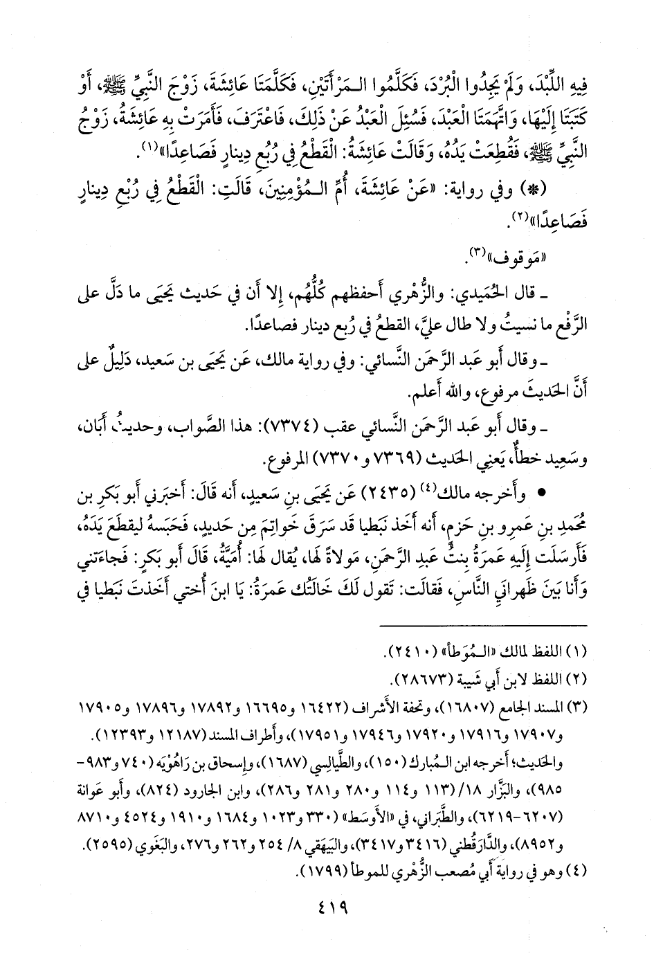 - وفي رواية: «عن عائشة، أُم المؤمنين، قالت: القطع في ربع دينار فصاعدا» (¬١).