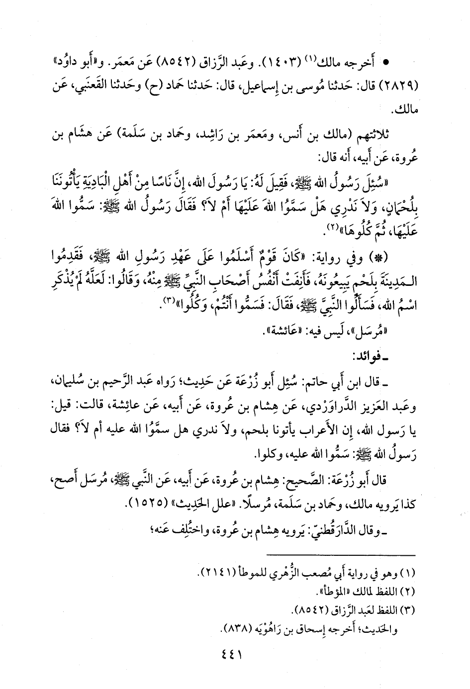 - قال ابن أبي حاتم: سئل أَبو زُرعَة عن حديث؛ رواه عبد الرحيم بن سليمان، وعبد العزيز الدراوَرْدي، عن هشام بن عروة، عن أبيه، عن عائشة، قالت: قيل: يا رسول الله، إن الأعراب يأتونا بلحم، ولا ندري هل سموا الله عليه أم لا؟ فقال رسول الله صَلى الله عَليه وسَلم: سموا الله عليه، وكلوا.