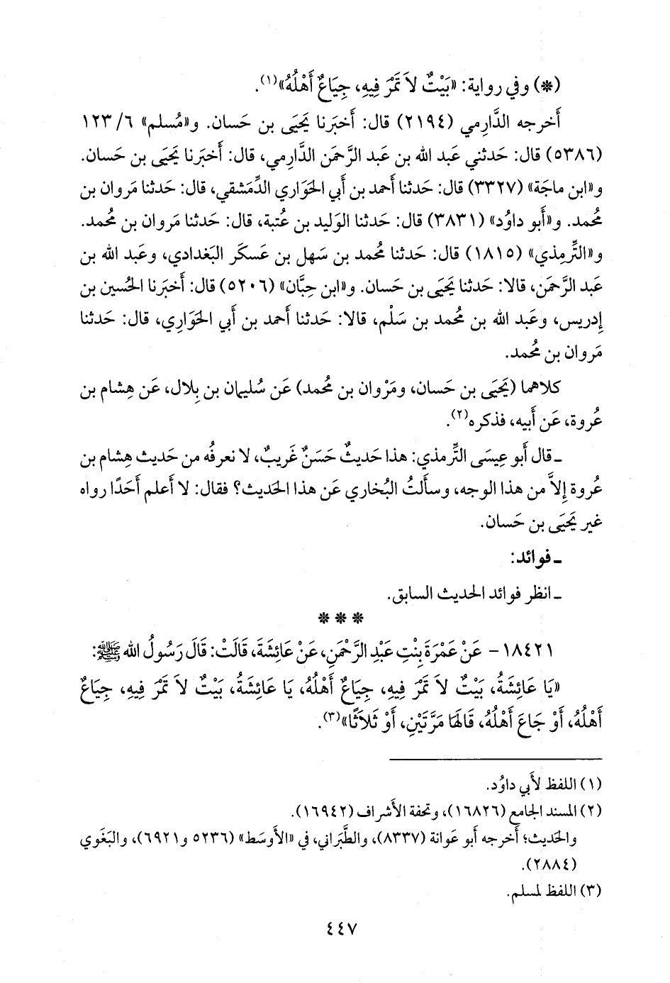 «يا عائشة، بيت لا تمر فيه، جياع أهله، يا عائشة، بيت لا تمر فيه، جياع أهله، أو جاع أهله، قالها مرتين، أو ثلاثا» (¬١).