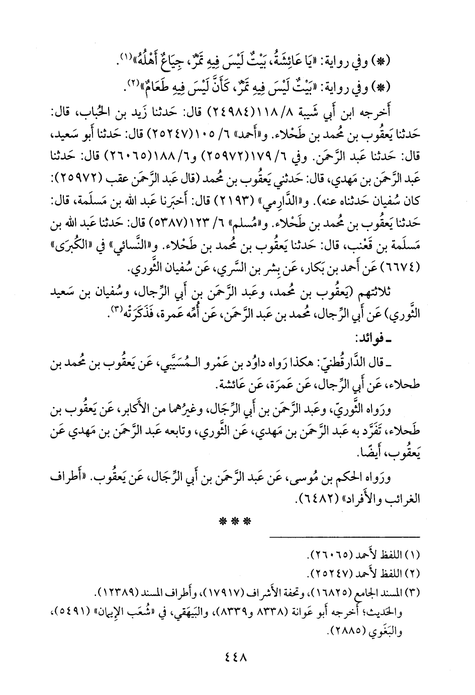 - قال الدارقُطني: هكذا رواه داود بن عَمرو المُسَيبي، عن يعقوب بن محمد بن طحلاء، عن أبي الرجال، عن عَمرَة، عن عائشة.