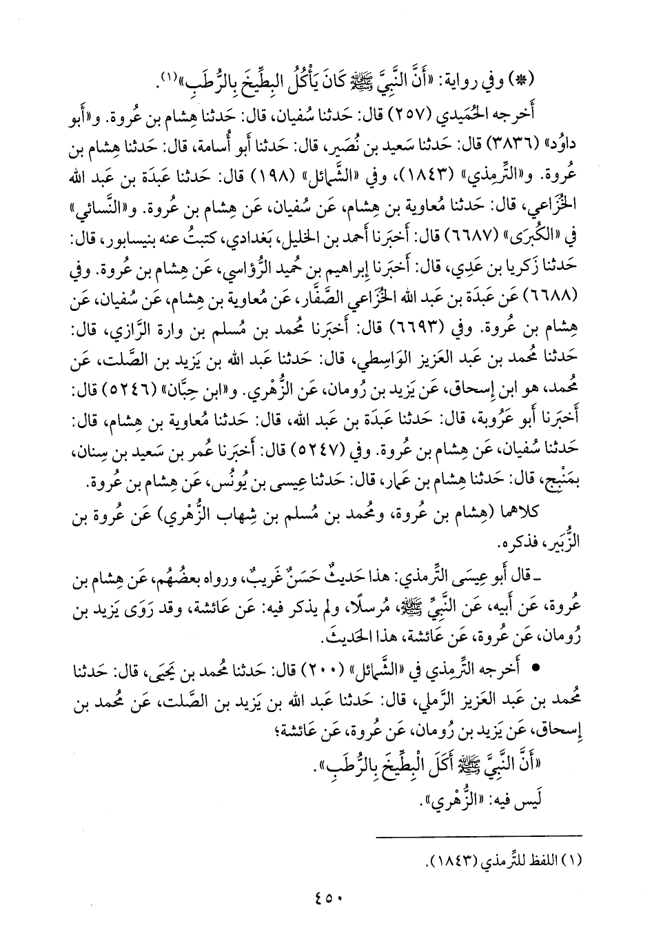 «أن النبي صَلى الله عَليه وسَلم أكل البطيخ بالرطب».