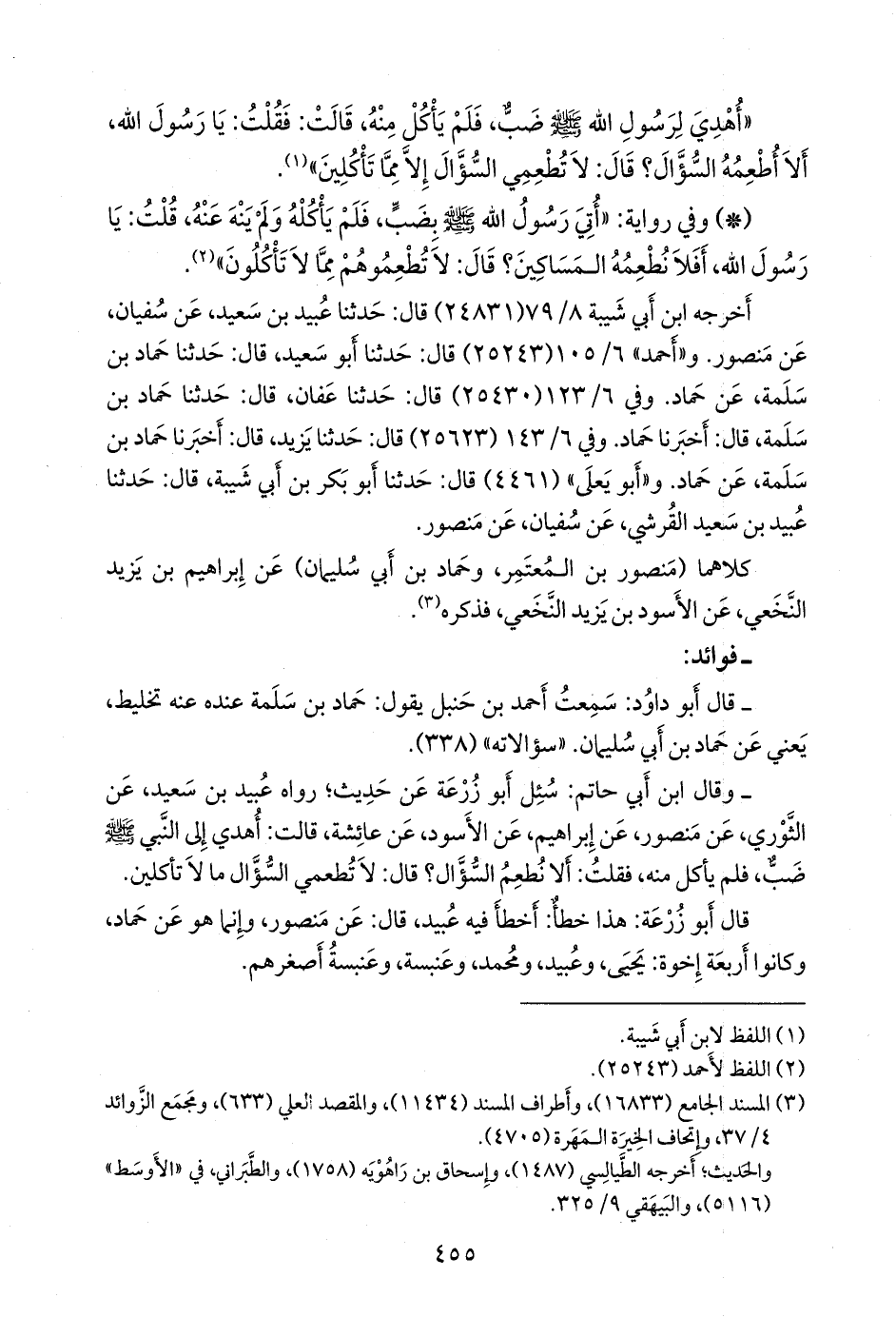 - وقال ابن أبي حاتم: سئل أَبو زُرعَة عن حديث؛ رواه عبيد بن سعيد، عن الثوري، عن منصور، عن إبراهيم، عن الأسود، عن عائشة، قالت: أهدي إلى النبي صَلى الله عَليه وسَلم ضب، فلم يأكل منه، فقلت: ألا نطعم السؤال؟ قال: لا تطعمي السؤال ما لا تأكلين.