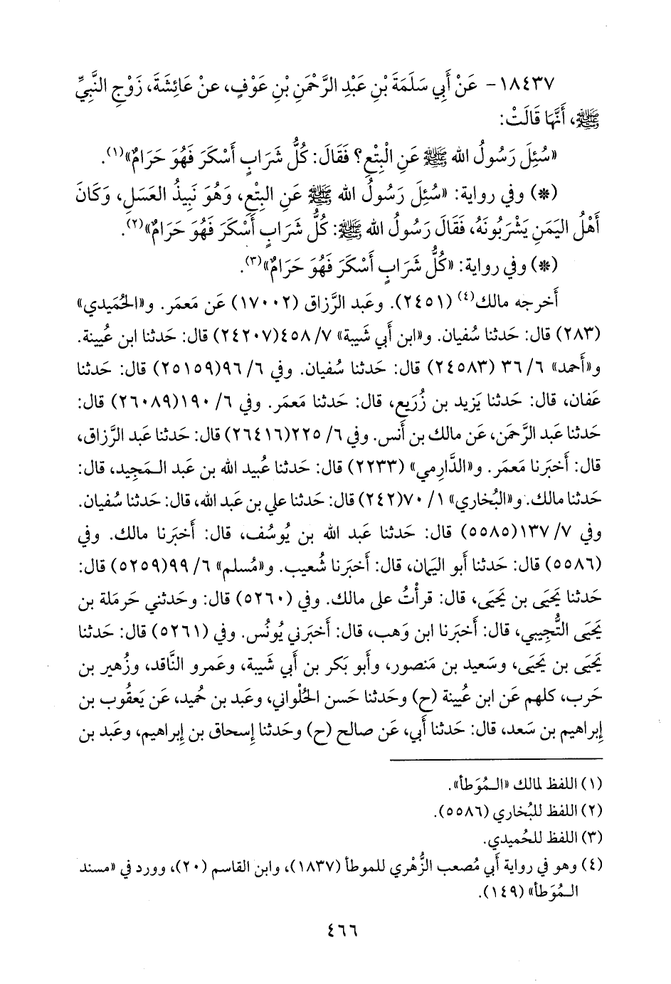 - وفي رواية: «سئل رسول الله صَلى الله عَليه وسَلم عن البتع، وهو نبيذ العسل، وكان أهل اليمن يشربونه، فقال رسول الله صَلى الله عَليه وسَلم: كل شراب أسكر فهو حرام» (¬٢).