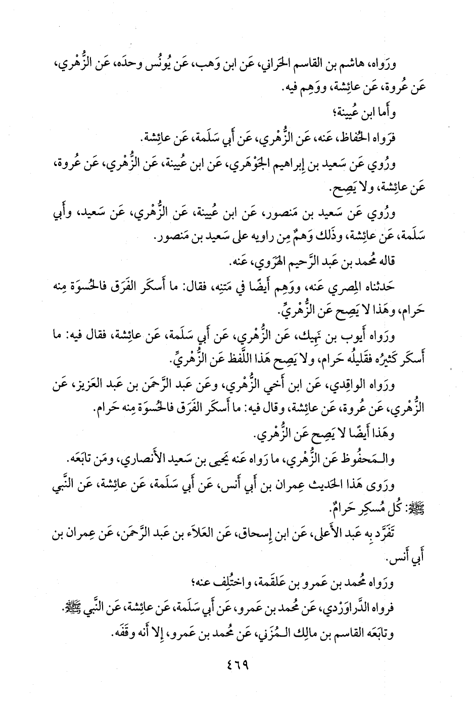 ورواه أيوب بن نَهِيك، عن الزُّهْري، عن أبي سلمة، عن عائشة، فقال فيه: ما أسكر كثيره فقليله حرام، ولا يصح هذا اللفظ عن الزُّهْري.