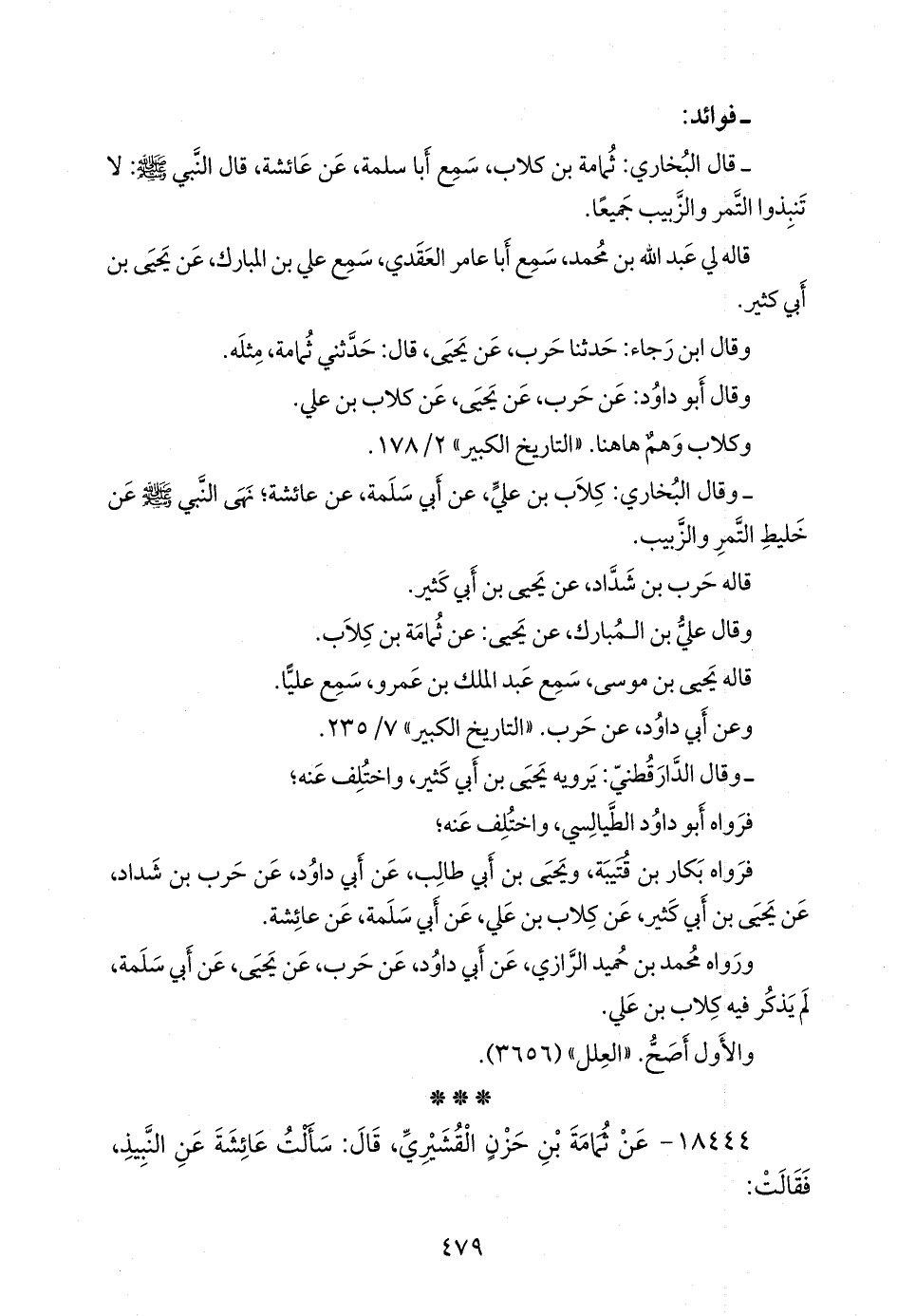- قال البخاري: ثمامة بن كلاب، سمع أبا سلمة، عن عائشة، قال النبي صَلى الله عَليه وسَلم: لا تنبذوا التمر والزبيب جميعا.