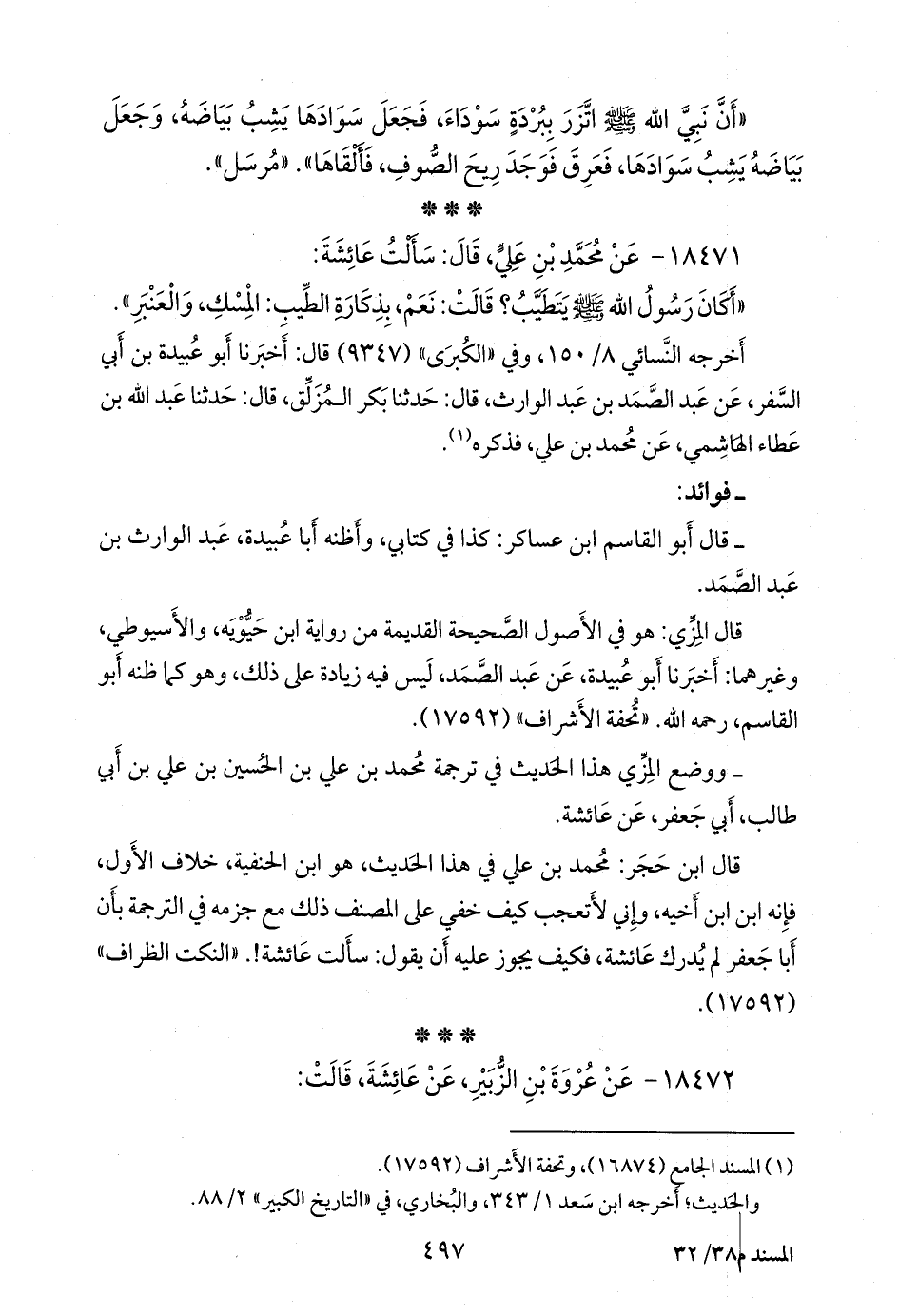 - ووضع المِزِّي هذا الحديث في ترجمة محمد بن علي بن الحسين بن علي بن أبي طالب أبي جعفر، عن عائشة.