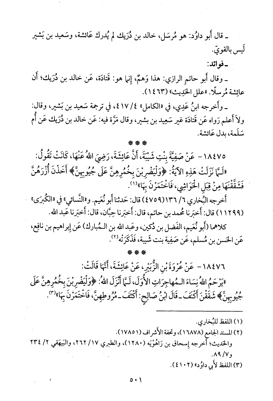 - قلنا: إِسناده ضعيفٌ؛ قال أَبو حاتم الرازي: هذا وهم، إنما هو: قتادة، عن خالد بن دريك؛ أن عائشة مُرسلًا. «علل الحديث» (١٤٦٣).