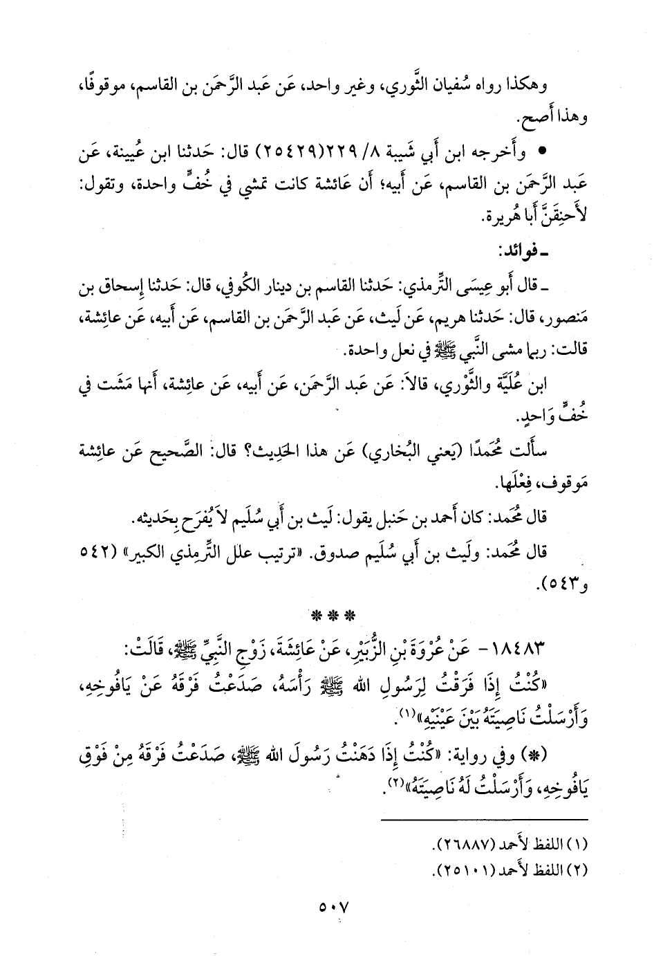 ابن عُلَية والثوري، قالا: عن عبد الرَّحمَن، عن أبيه، عن عائشة، أنها مشت في خف واحد.