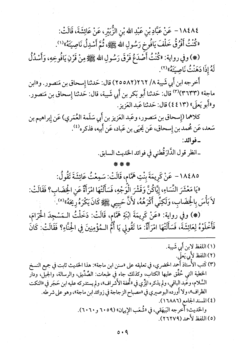 - وفي رواية: «عن كريمة ابنة همام، قالت: دخلت المسجد الحرام، فأخلوه لعائشة، فسألتها امرأة: ما تقولي يا أُم المؤمنين في الحناء؟ فقالت: كان