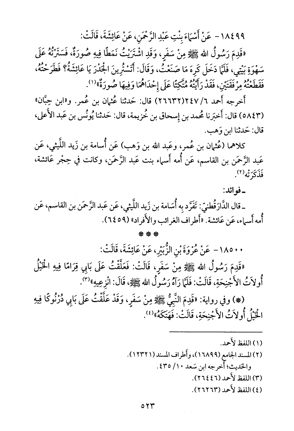 كلاهما (عثمان بن عمر، وعبد الله بن وهب) عن أسامة بن زيد الليثي، عن عبد الرَّحمَن بن القاسم، عن أمه أسماء بنت عبد الرَّحمَن، وكانت في حجر عائشة، فذكرته (¬٢).