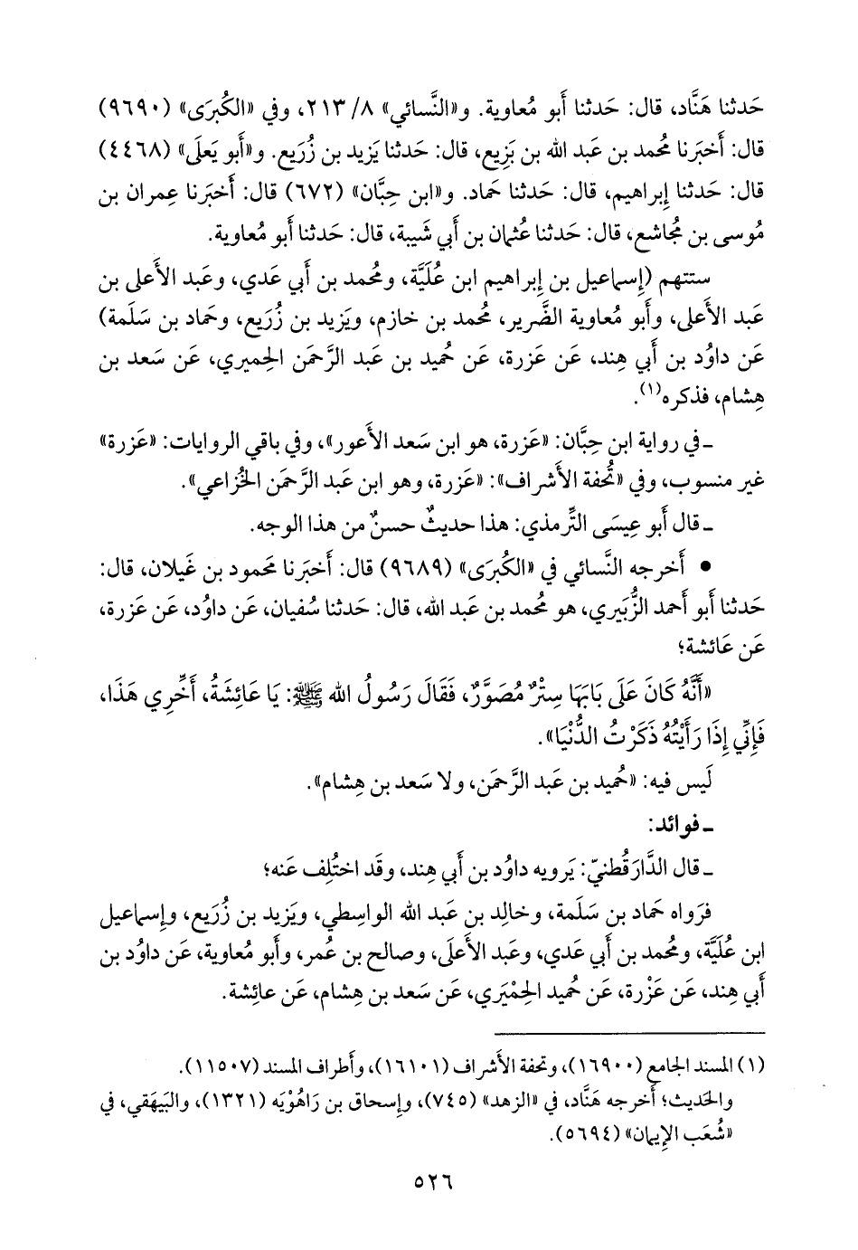 فرواه حماد بن سلمة، وخالد بن عبد الله الواسطي، ويزيد بن زُريع، وإسماعيل ابن عُلَية، ومحمد بن أَبي عَدي، وعبد الأعلى، وصالح بن عمر، وأَبو معاوية، عن داود بن أبي هند، عن عَزرة، عن حميد الحميري، عن سعد بن هشام، عن عائشة.