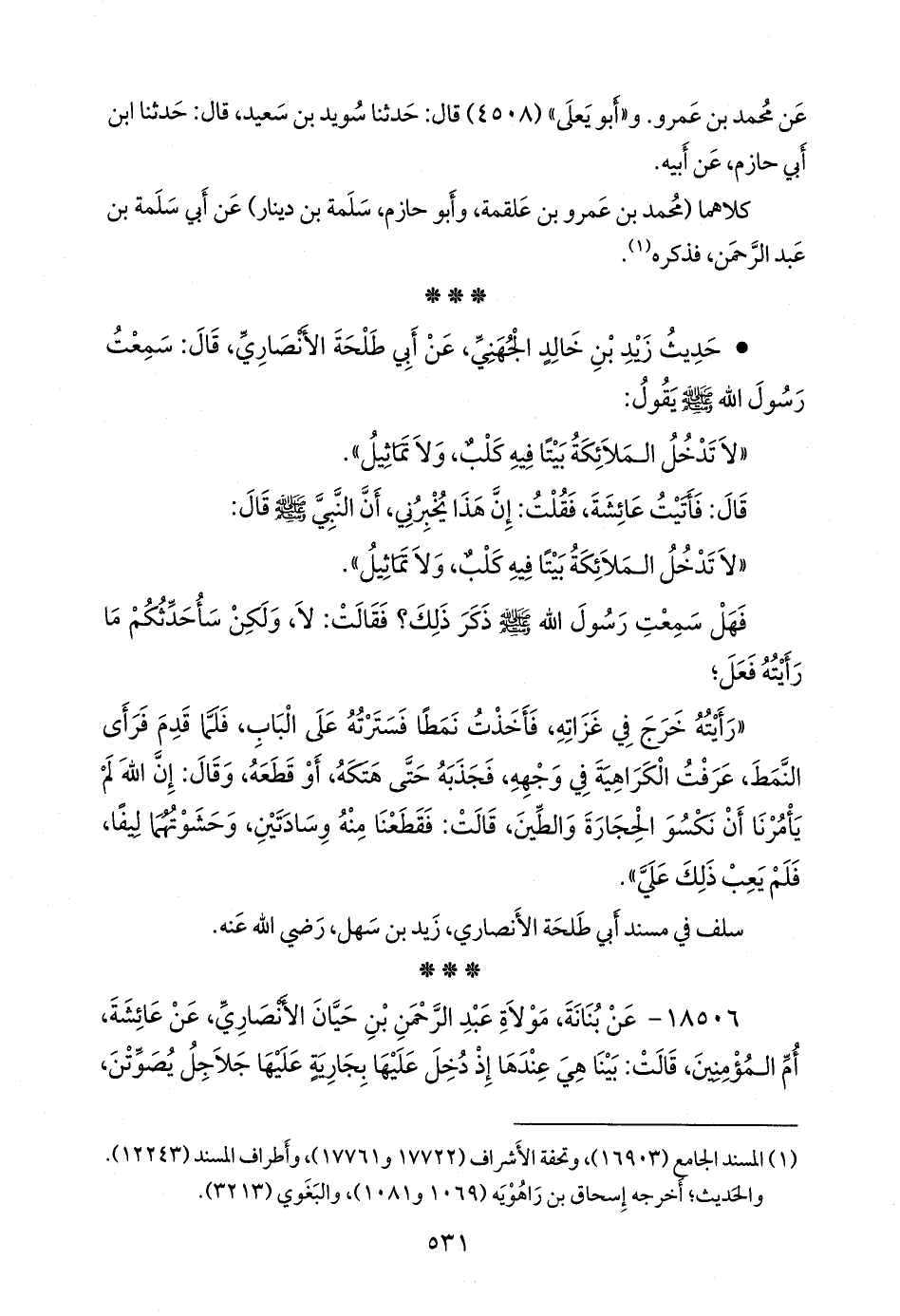 • حديث زيد بن خالد الجهني، عن أبي طلحة الأَنصاري، قال: سمعت رسول الله صَلى الله عَليه وسَلم يقول: