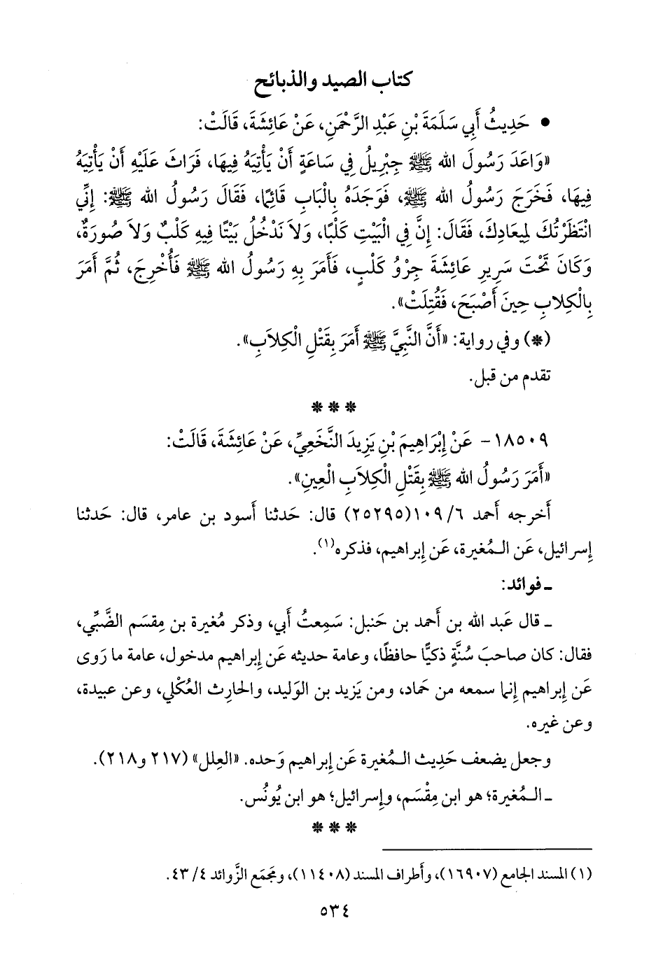 «واعد رسول الله صَلى الله عَليه وسَلم جبريل في ساعة أن يأتيه فيها، فراث عليه أن يأتيه فيها، فخرج رسول الله صَلى الله عَليه وسَلم فوجده بالباب قائما، فقال رسول الله صَلى الله عَليه وسَلم: إني انتظرتك لميعادك، فقال: إن في البيت كلبا، ولا ندخل بيتا فيه كلب ولا صورة، وكان تحت سرير عائشة جرو كلب، فأمر به رسول الله صَلى الله عَليه وسَلم فأخرج، ثم أمر بالكلاب حين أصبح، فقتلت».