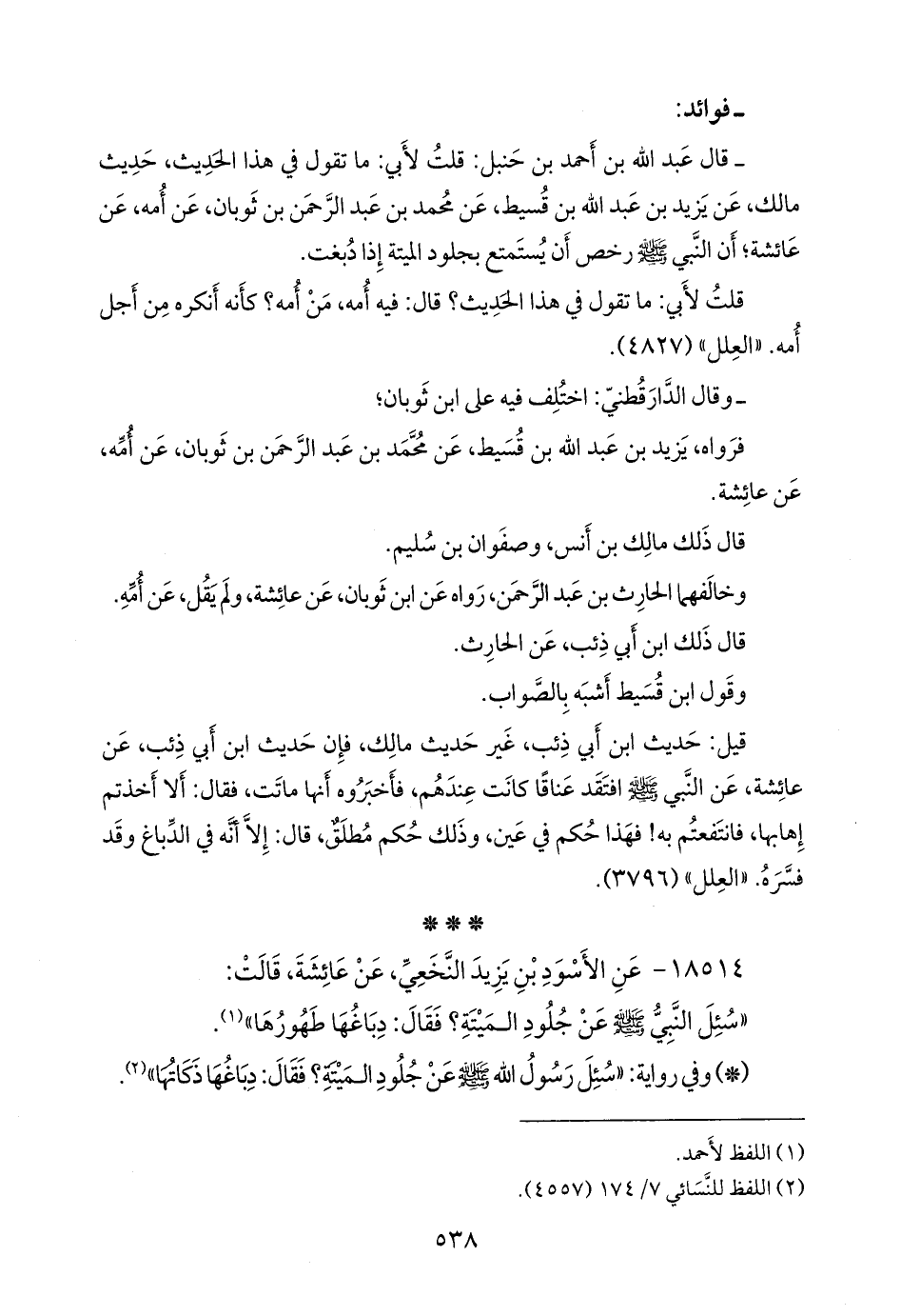 - قال عبد الله بن أحمد بن حنبل: قلت لأبي: ما تقول في هذا الحديث، حديث مالك، عن يزيد بن عبد الله بن قسيط، عن محمد بن عبد الرَّحمَن بن ثوبان، عن أمه، عن عائشة؛ أن النبي صَلى الله عَليه وسَلم رخص أن يستمتع بجلود الميتة إذا دبغت.