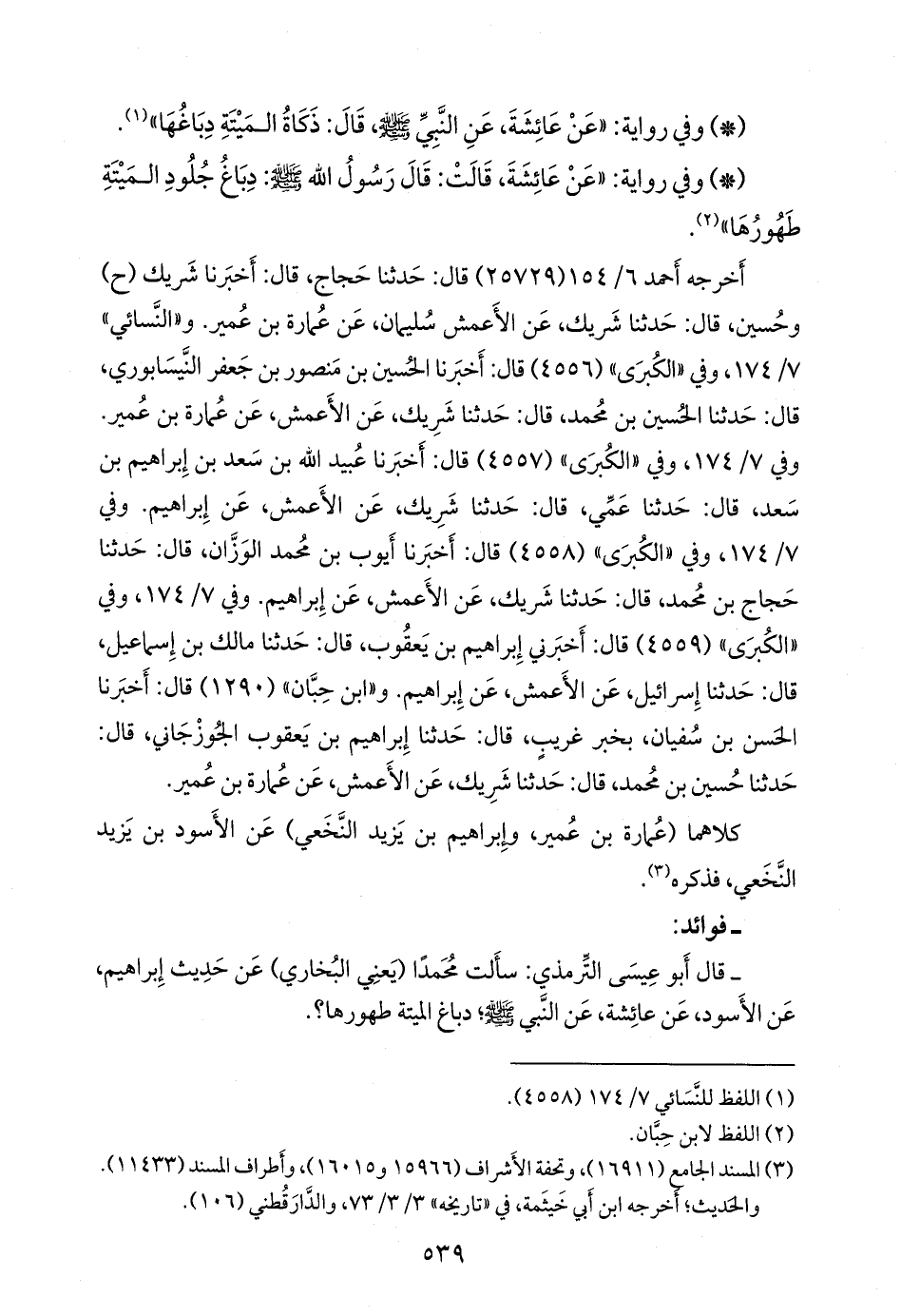 - قال التِّرمِذي: سألتُ محمدًا، يعني ابن إسماعيل البخاري، عن حديث إبراهيم، عن الأسود، عن عائشة، عن النبي صَلى الله عَليه وسَلم؛ دباغ الميتة طهورها؟.