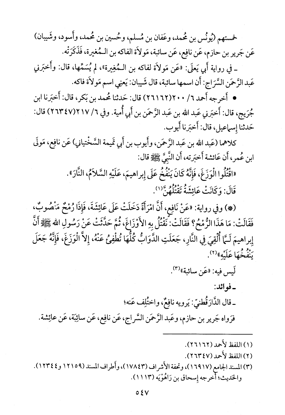 فرواه جَرير بن حازم، وعبد الرَّحمَن السراج، عن نافع، عن سائبة، عن عائشة.