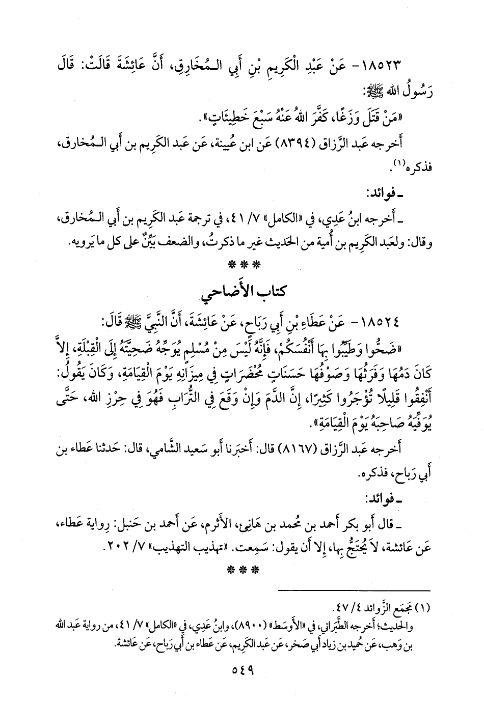 والحديث؛ أخرجه الطبراني في «الأوسط» (٨٩٠٠)، وابن عَدي في «الكامل» ٧/ ٤١، من رواية عبد الله بن وهب، عن حميد بن زياد أبي صخر، عن عبد الكريم، عن عطاء بن أبي رباح، عن عائشة.