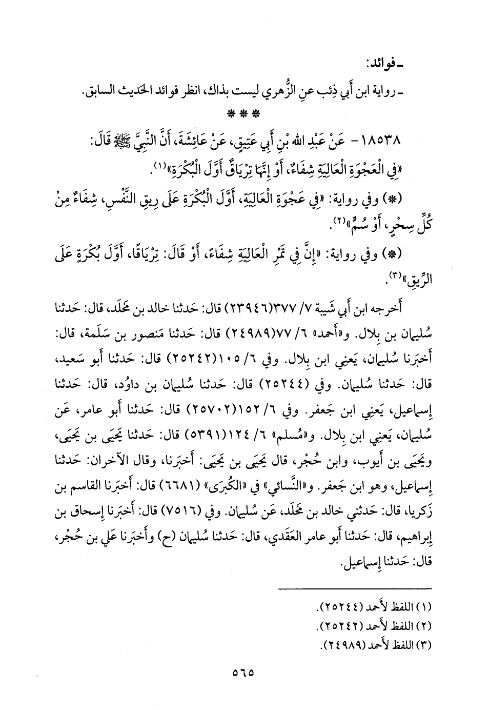- وفي رواية: «إن في تمر العالية شفاء، أو قال: ترياقا، أول بكرة على الريق» (¬٣).