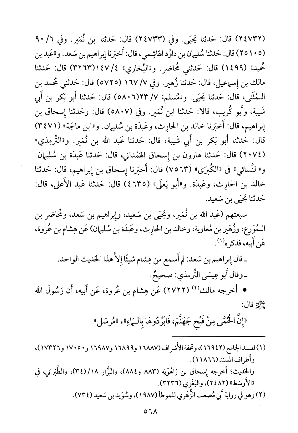 سبعتهم (عبد الله بن نُمير، ويحيى بن سعيد، وإبراهيم بن سعد، ومُحاضِر بن المُوَرِّع، وزهير بن معاوية، وخالد بن الحارث، وعَبدة بن سليمان) عن هشام بن عروة، عن أبيه، فذكره (¬١).