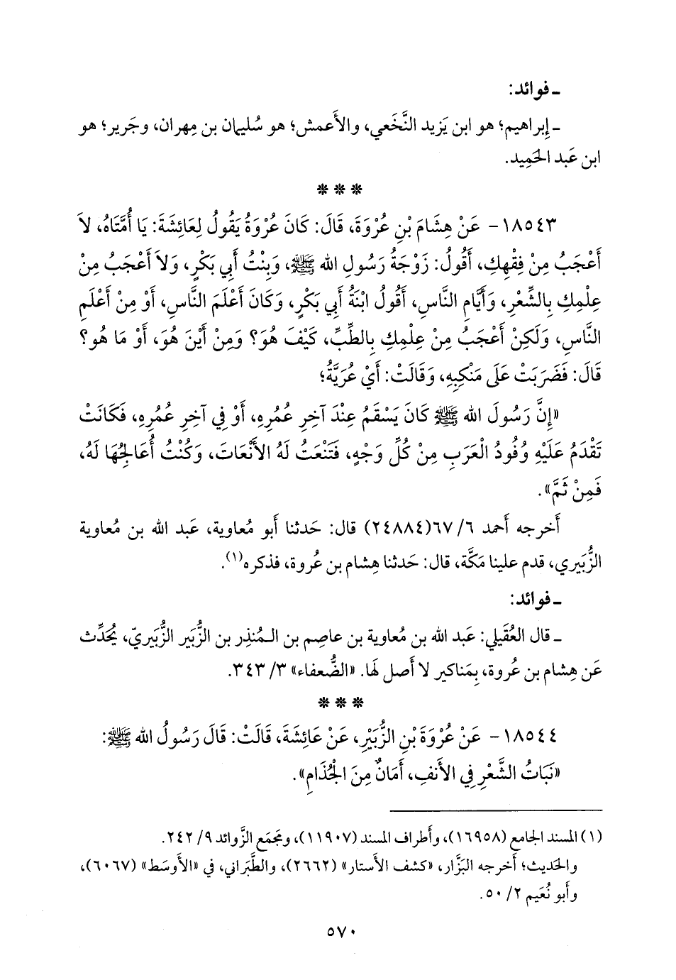 ١٨٥٤٣ - عن هشام بن عروة، قال: كان عروة يقول لعائشة: يا أمتاه، لا أعجب من فقهك، أقول: زوجة رسول الله صَلى الله عَليه وسَلم وبنت أَبي بكر، ولا أعجب من علمك بالشعر، وأيام الناس، أقول ابنة أَبي بكر، وكان أعلم الناس، أو من أعلم الناس، ولكن أعجب من علمك بالطب، كيف هو؟ ومن أين هو، أو ما هو؟ قال: فضربت على منكبه، وقالت: أي عرية؛